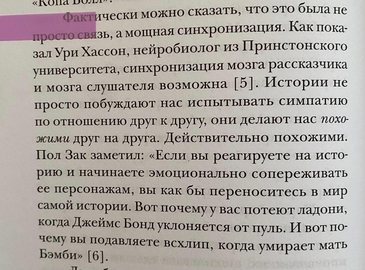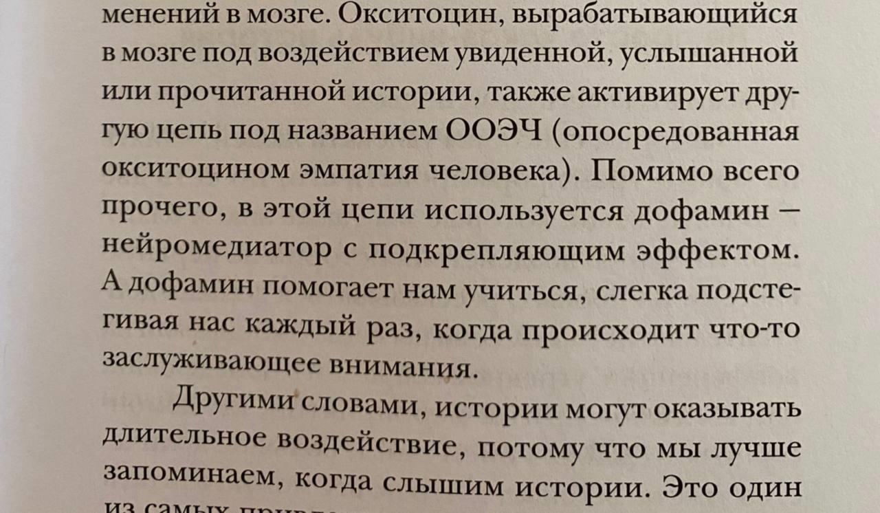 И вот… книги о сторителлинге начали упоминать об исследованиях, доказывающих, что мозг выдуманные истории хранит там же, где и наши воспоминания. И что вырабатываем мы при прочтении те же гормоны, как если бы были героями книги.