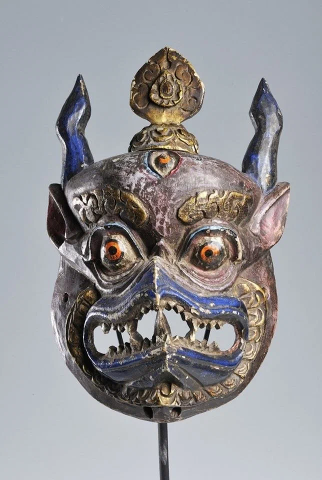 9) Маска Гаруды, полихромные пигменты и позолота по дереву, Бутан, первая половина XX века.