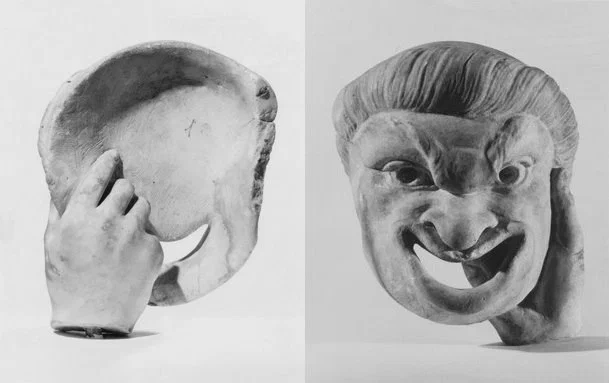 2) Римская комическая маска и держащая ее правая рука из мрамора, II в. н.э. Коллекция Бруклинского музея, США.