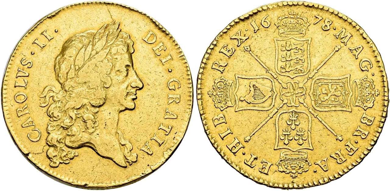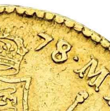 Одна из самых крупных золотых монет в истории - 5 гиней - более 40 граммов золота. На штемпеле была перерезана последняя цифра года - из 7 сделали 8. Фотка с сайта аукциона Синкона, где я когда-то работал