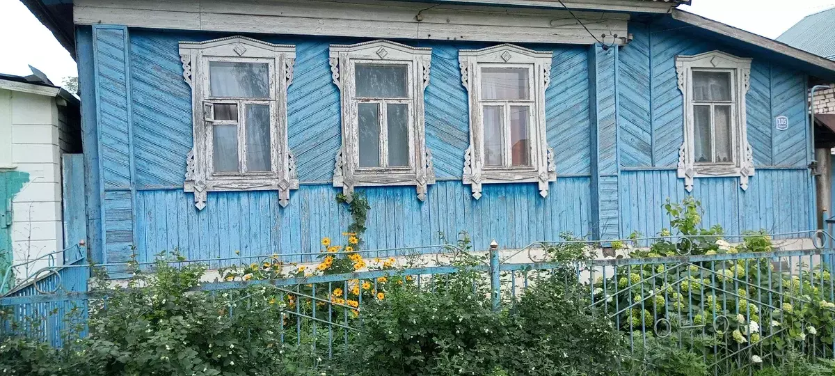 И это не случайно, потому что одноэтажные улочки окраин города мало чем архитектурно отличались от моей улицы, даже наличники на окнах домов в Выксе были типичными для нашего села, ничего не обычного - сверху короткий кокошник-треугольник, снижу короткий подол, знак быка во лбу, под кокошником, рукава украшены накладным орнаментом. Встречаются и каменные дома с каменными наличниками.