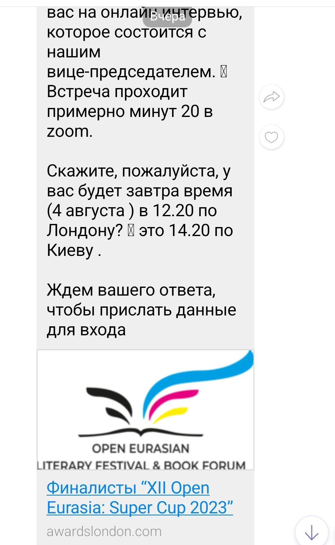 Я опять стала финалистом Евразийского конкурса писателей 2023 года среди авторов короткого рассказа, опять у меня хотят взять интервью.
