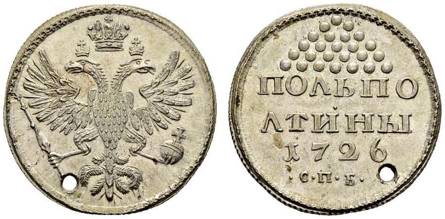 Дырка в или на монете. Полполтины 1726 (25 копеек) с дыркой. Но это была «какая надо дырка» за 300 с лишним тысяч доллеров на Синконе. Через отверстие образцовую монету прикрепляли к сопроводительной грамоте