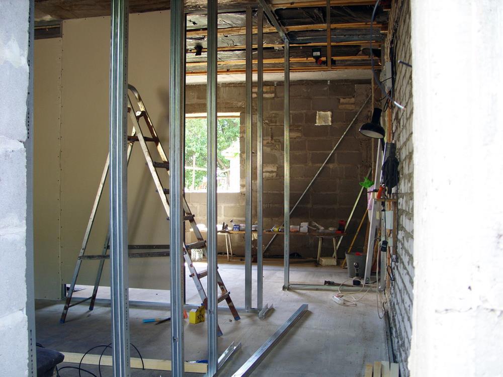 3. Ставим окна, делаем разметку будущих комнат, возводим профиль, проводим электрику (провода с разметкой под будущие розетки, выключатели и лампочки, обшиваем профиль гипсокартоном, шпаклюем, наждачим.