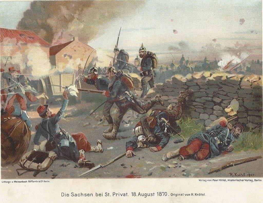 Рано утром 18 августа 1870 года немцы нанесли удар по Сен-Прива. Атака шла в полном соответствии с планом Мольтке — по открытой местности в лобовую. Удар наносила 1-я гвардейская пехотная дивизия. Первым в атаку шел 1-й гренадерский полк.