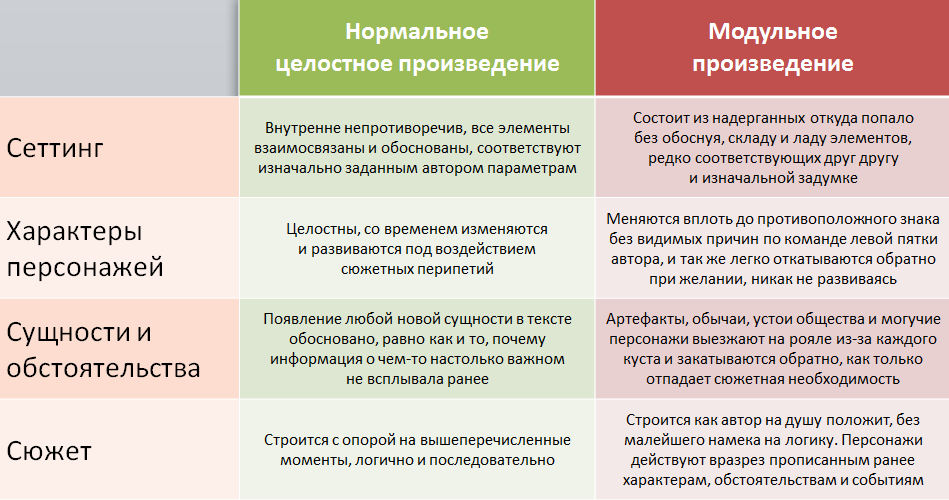 Резюме: модульное произведение выглядит так, будто автор все время его начинает заново, не пытаясь пристыковать каждый новый модуль к уже прописанным. Поэтому в его эклектичном мире попадаются элементы, взятые из разных эпох и жанров, плохо сочетающиеся друг с другом (хотя сами по себе они могут быть прописаны нормально), и автор не пытается их свести в единую систему, обосновать, почему и зачем эти элементы сохранились в архаичной форме или внезапно обгоняют остальной мир по уровню развития. Поэтому каждое появление персонажа - фактически, первое. И персонаж, появлявшийся раньше, не обязан выглядеть и вести себя так же, как и в прошлый раз. Поэтому любая сущность, любой артефакт, любое утверждение относительно законов мироустройства, любой второстепенный персонаж - это просто реквизит для одного-единственного номера, и ничего из этого в новых модулях, скорее всего, не появится, даже если бы его появление и было реально уместным. Поэтому для автора модульных произведений нет проблем с добавлением любых сюжетных ходов и перекурочиванием собственного мира под эти ходы, он запросто игнорирует уже написанный текст и ни о чем написанном не вспоминает.