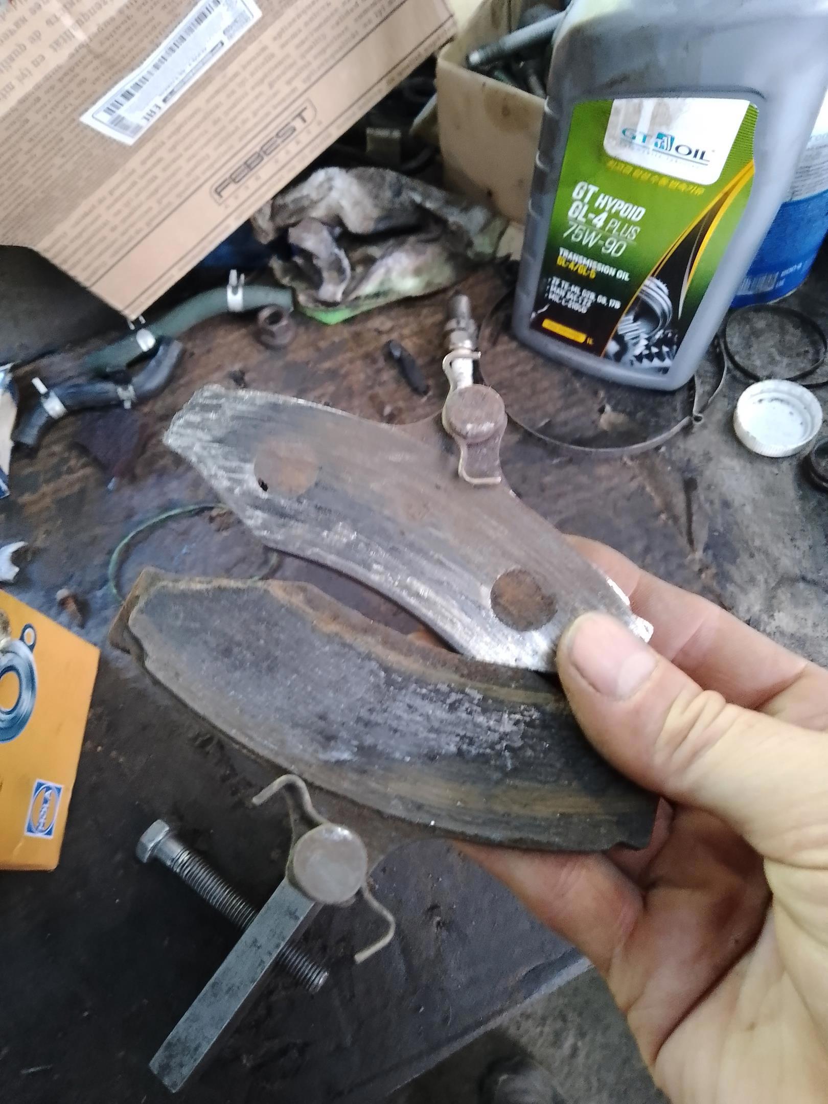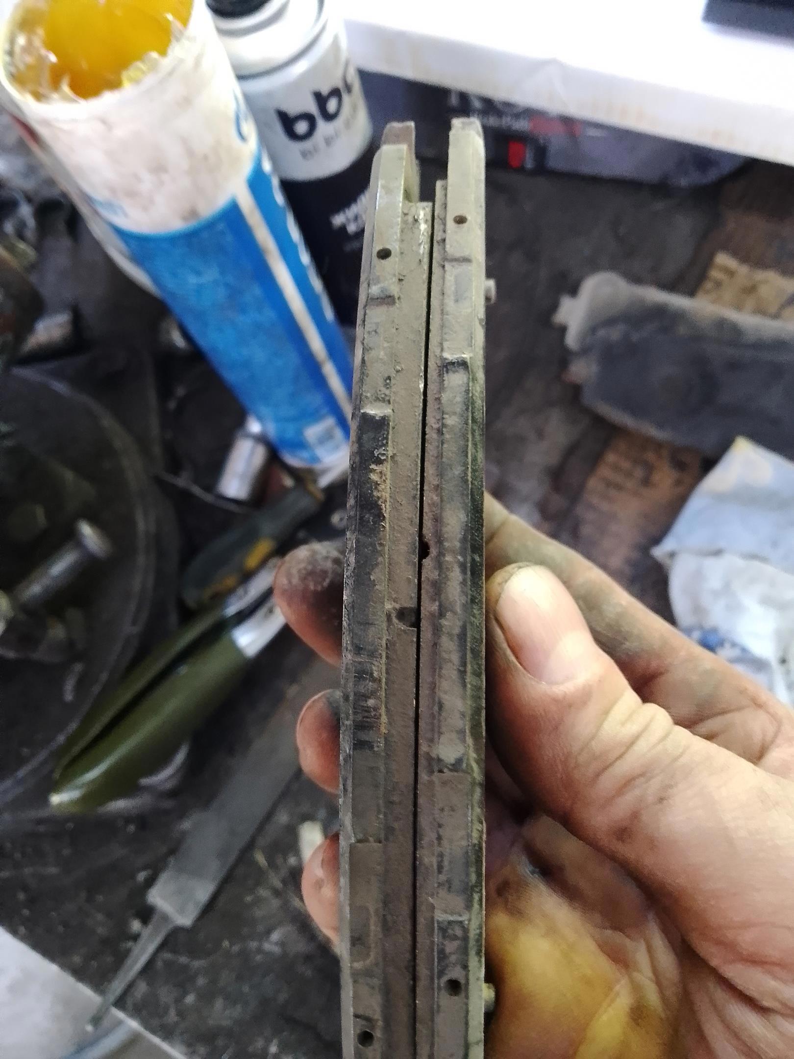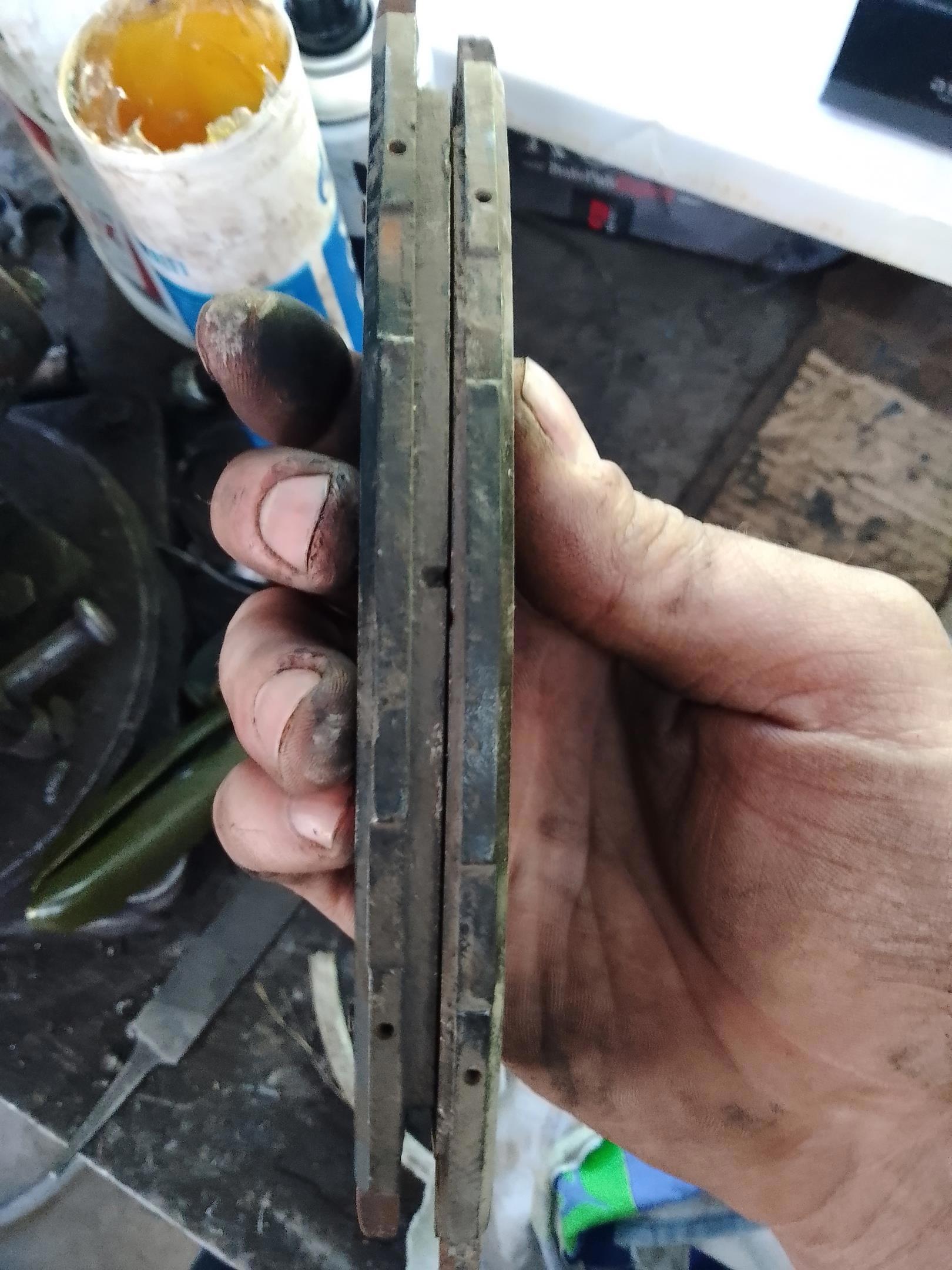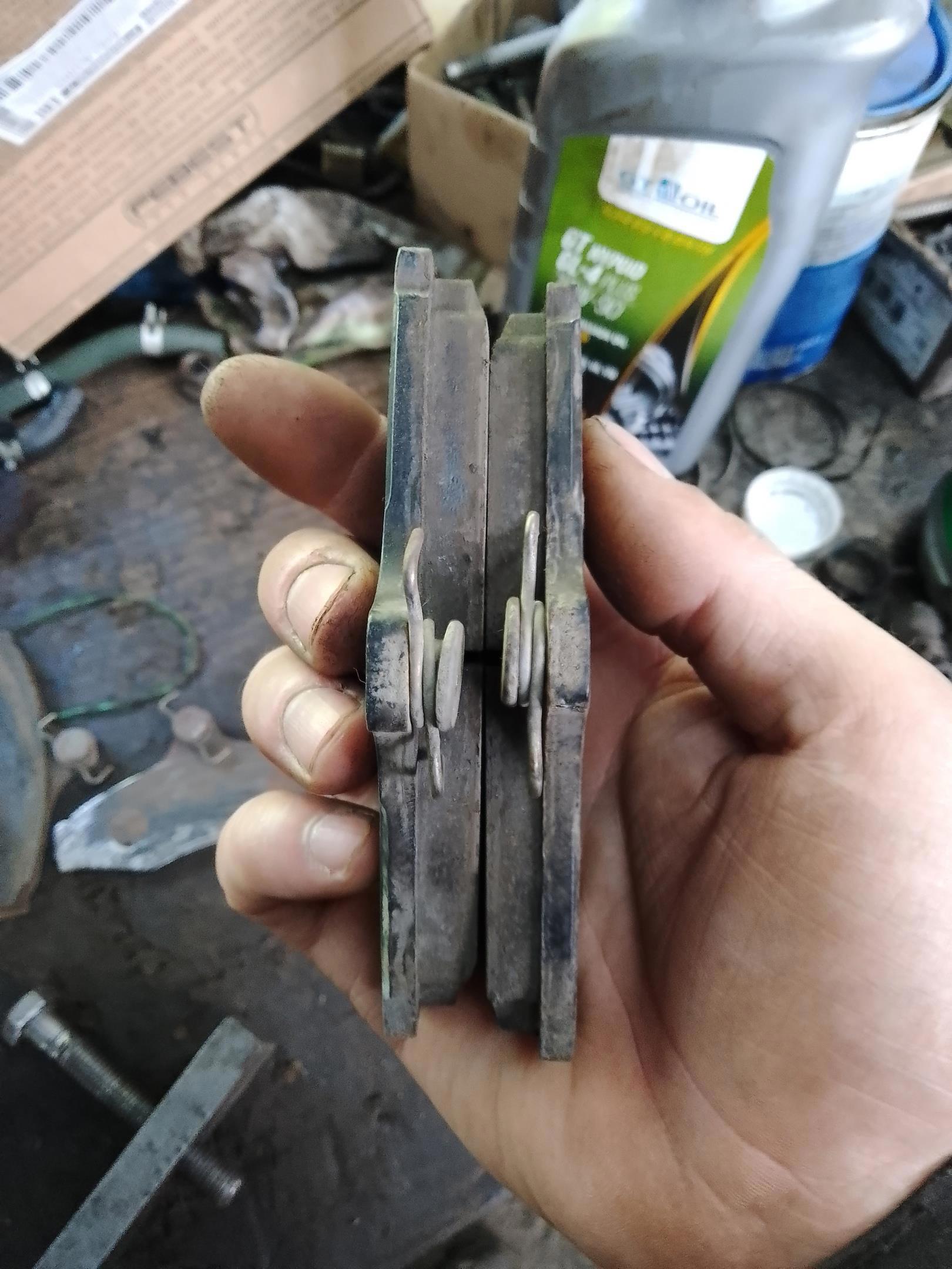 Вместо заявленных 30 минут провозился час, но своей работой остался доволен. Обратите внимание на износ диска с внутренней стороны: контакт колодки был не полный. Колодки с левого колеса, наружняя-внутренняя: