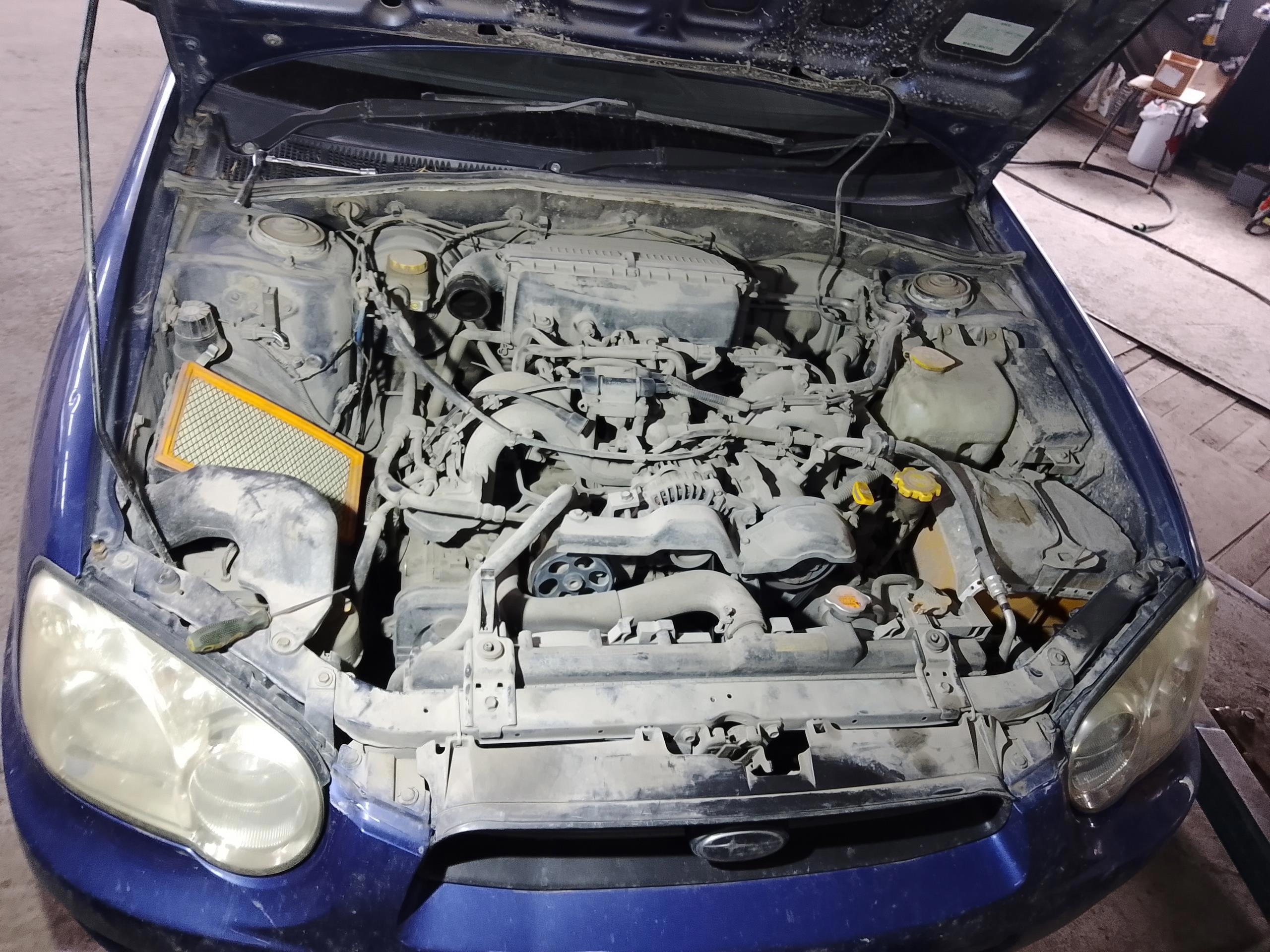 Приехала Субару Импреза вагон. Троит, пердит, привезла высоковольтные провода и датчик положения коленвала. С датчиком вообще отдельная история, но начнем с проводов. Я грешил на задний провод на правой головке (со стороны водителя), но не угадал, как оказалось. Немного подразобрано, чтоб получить доступ.