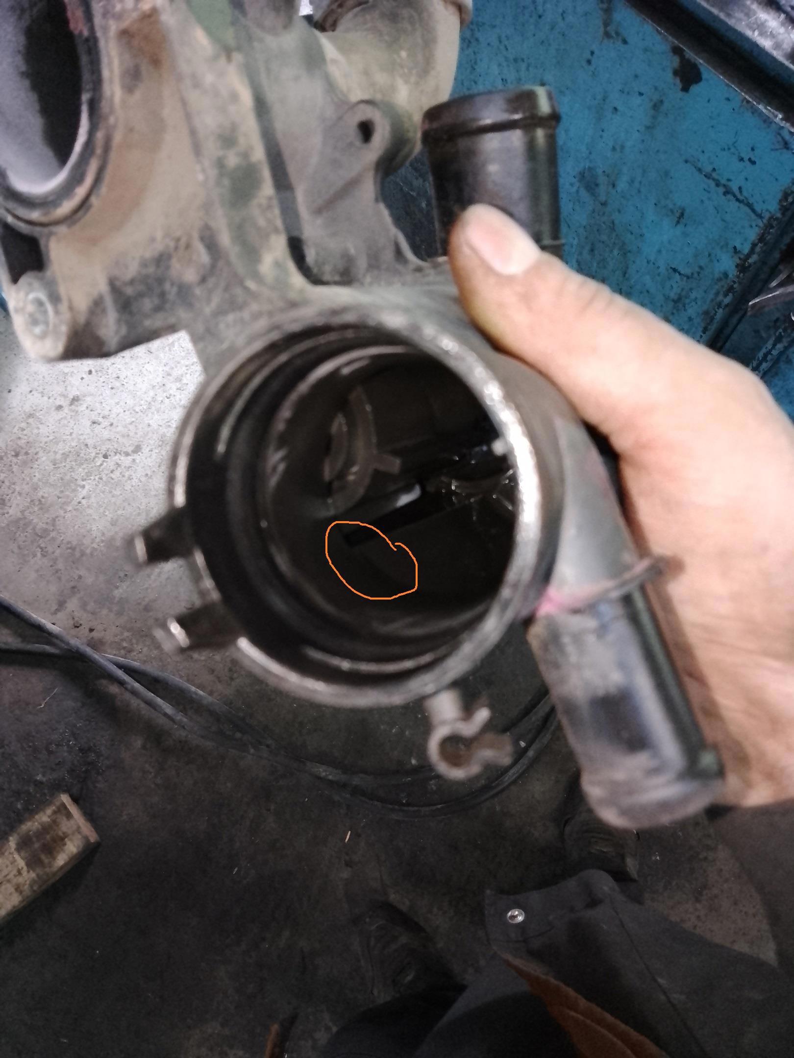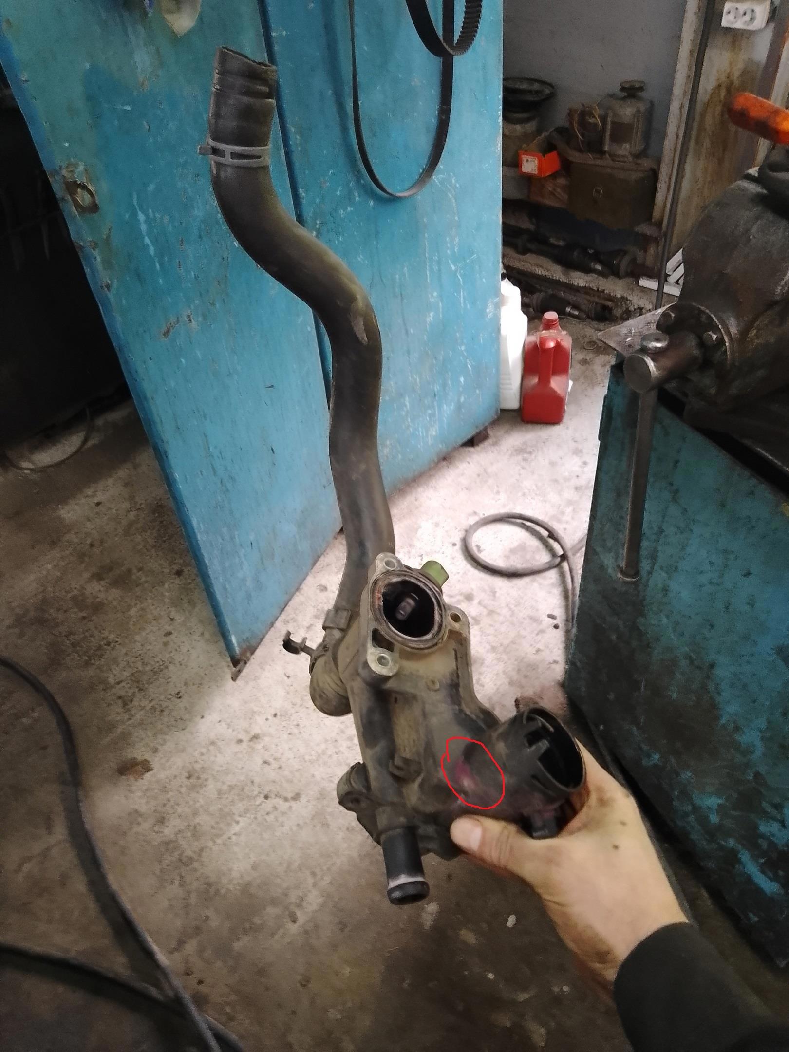 Виновный найден, доподлинно установлен, 18 тыщ потрачено не зря. Собираем, отправляем. В пятницу он опять приехал. Да, потёк! Я сразу снял впуск, всё осмотрел и ощупа, надули - течи нет, но потекло в другом месте... Оказалось - помпа! Мне, честно говоря, владельца этого ведра уже просто жалко, зарыть кучу денег в эту гнилуху - это за гранью добра и зла.