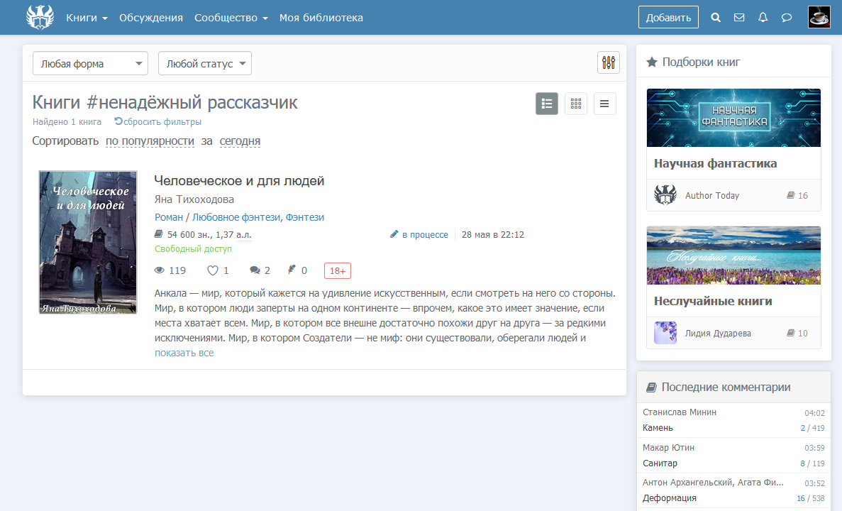 Ну что ж. Второго июня две тысячи девятнадцатого года я, Яна Тихоходова, приложив нотариально заверенные скриншоты, торжественно и принародно заявляю, что являюсь первым человеком на Author.Today, который использовал тэг #ненадёжный рассказчик.