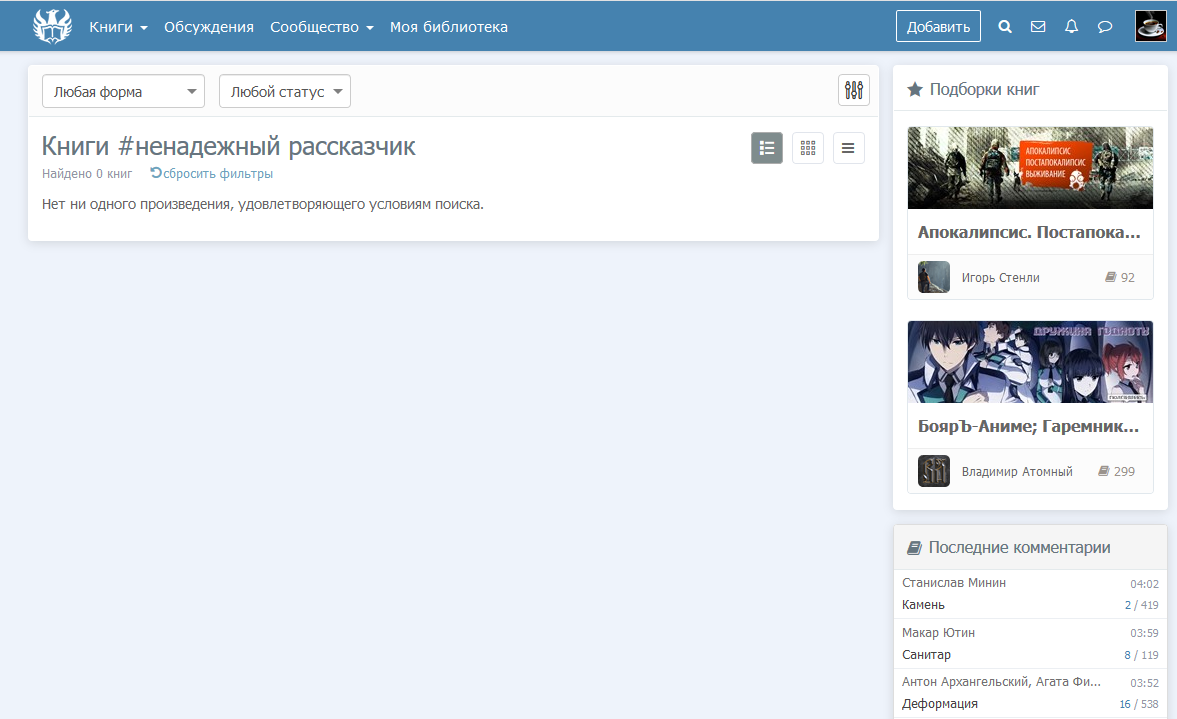 Но моё удивление было бесконечно искренним и искренне бесконечным, когда в уже используемых тэгах не нашлось "ненадёжного рассказчика". И нет его там и по сей день.