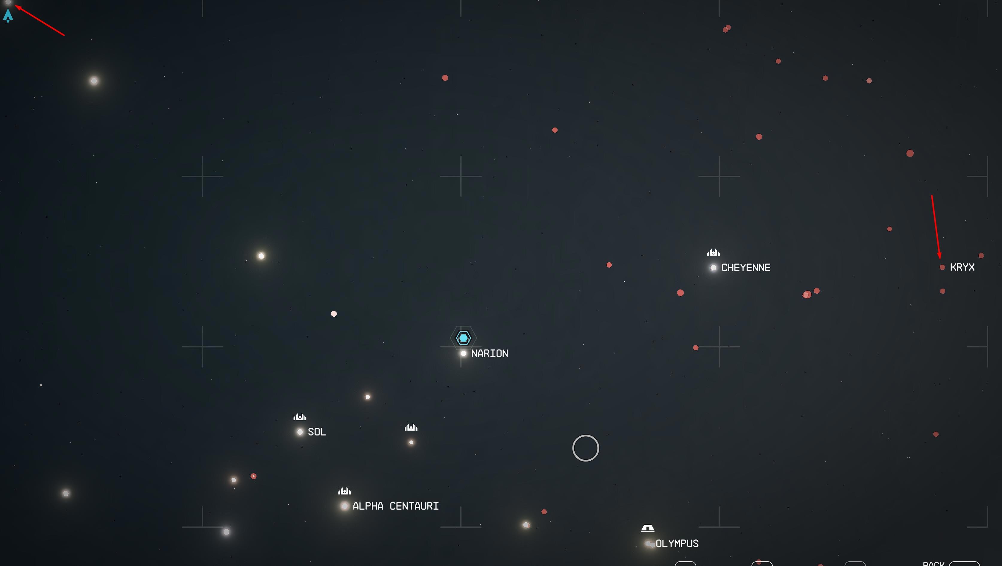 Находящаяся в левом верхнем углу звезда является самой крайней системой на левой половине доступной галактики - вторая половина карты начинается от системы KRYX и имеет примерно такую же плотность наполнения. Я не подсчитывал точное число систем, но меня терзают смутные сомнения, что тысячи планет пригодных для посещения тут всё же нет. Нет, если за таковые считать куски пустого камня в виде лун у планет гигантов, то может и наберётся, но реально планет, где вообще есть хоть что-то, кроме щебня или льда, в разы, если не на порядки меньше этой цифры.