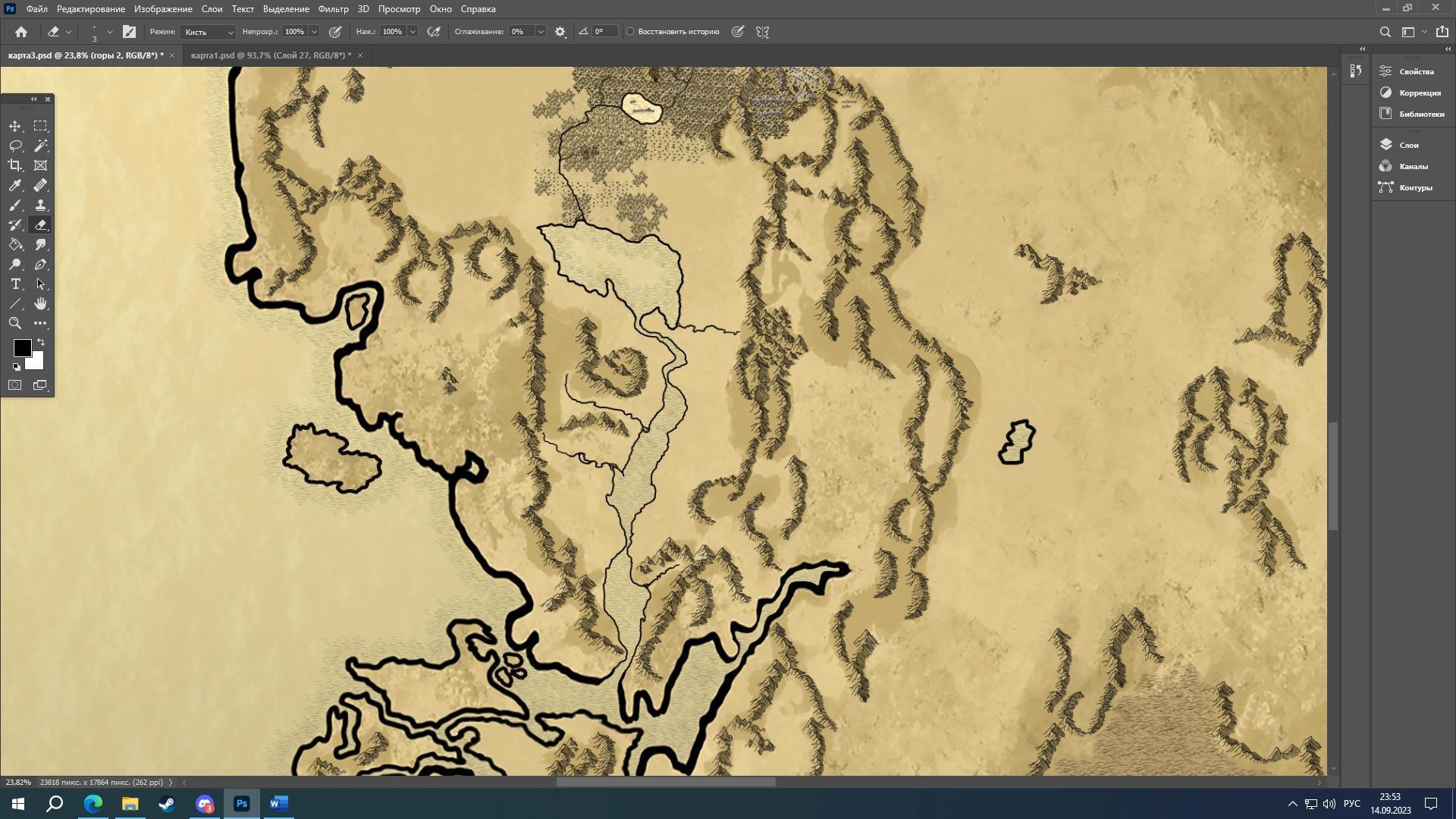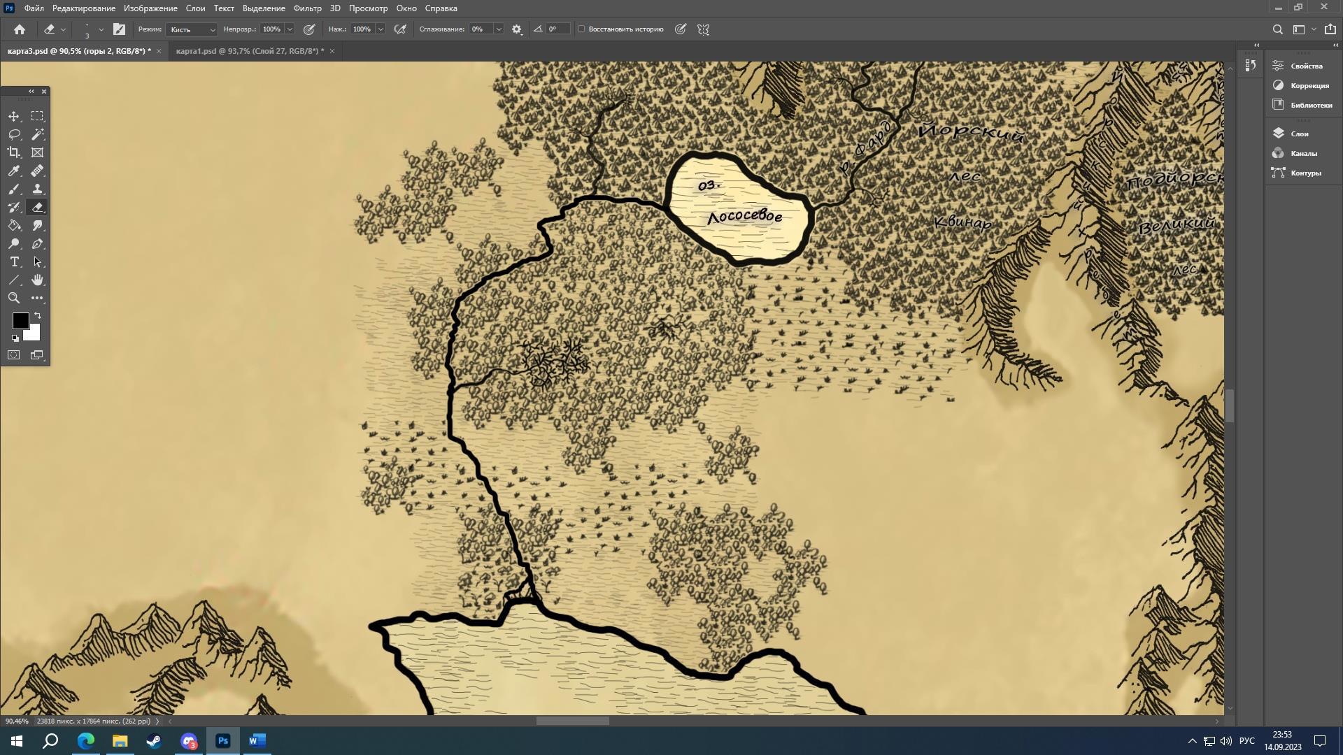 Автор: Константин КоханОкончив редактирование второй трети книги, решил немножко и карту разбавить. Добавил несколько морей и основу для будущих рек. Сам нижний регион карты (горы и тд.) я ещё не затрагивал. Названия на чб поменял, ибо красный глаза резал при работе.