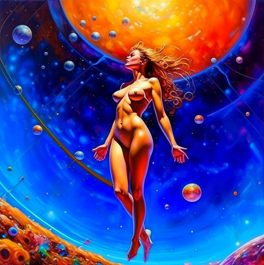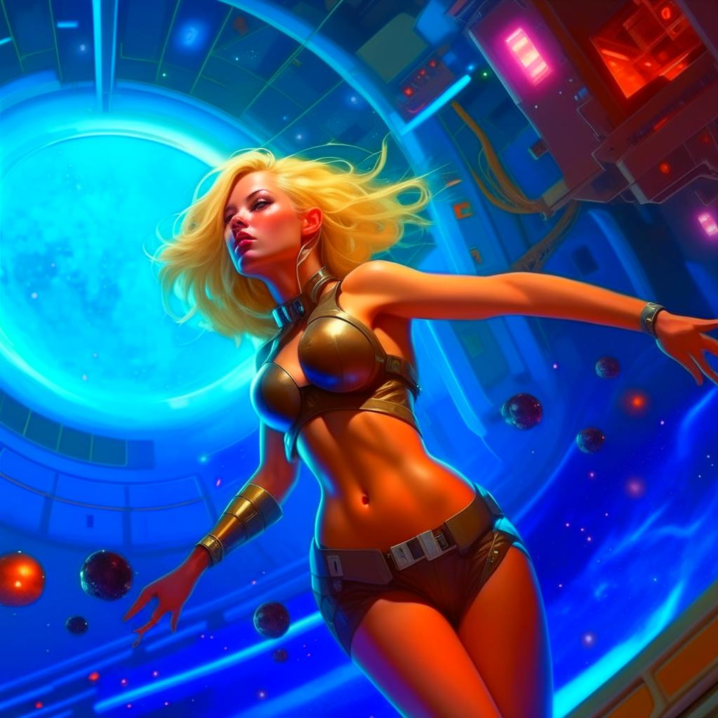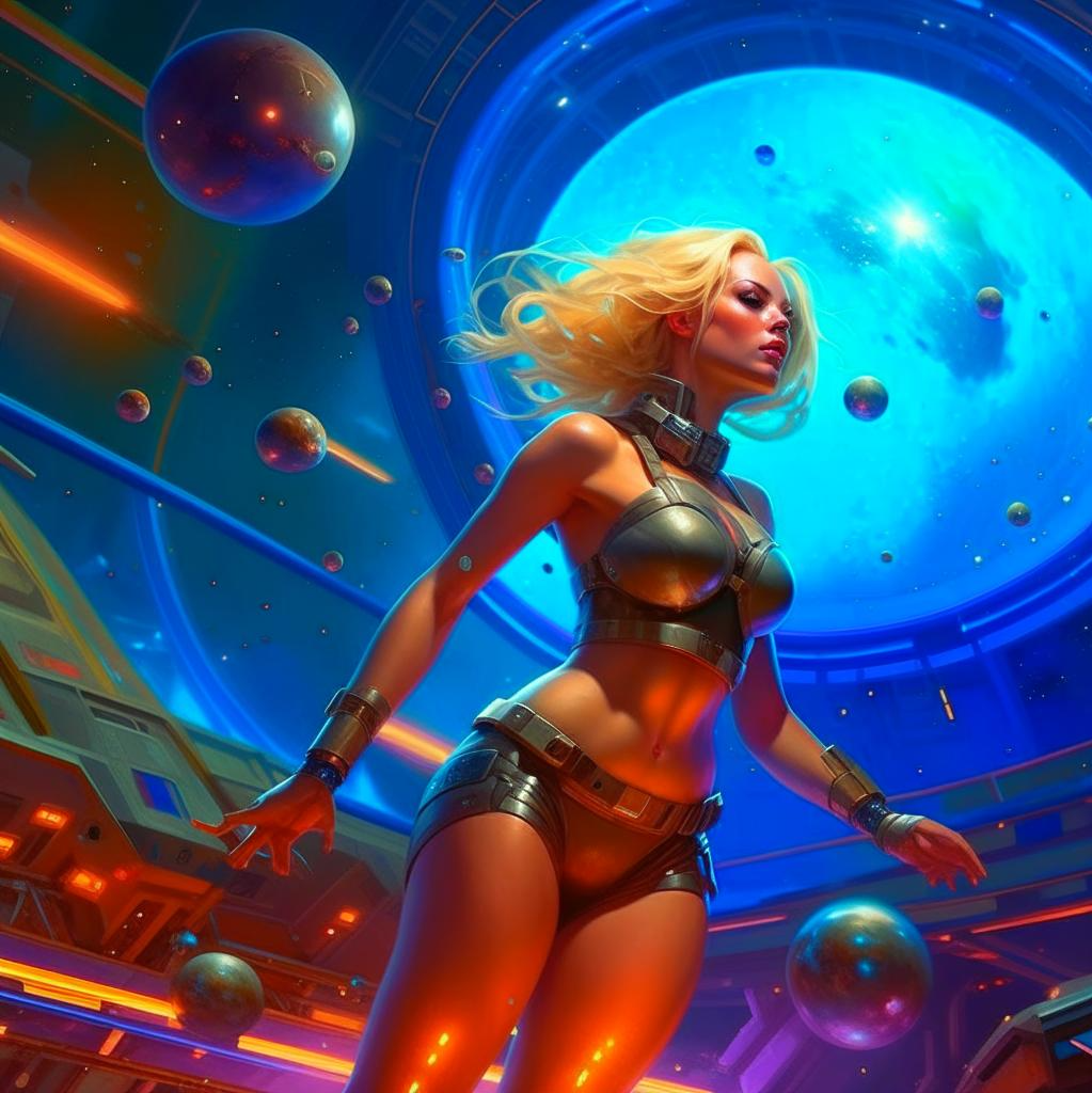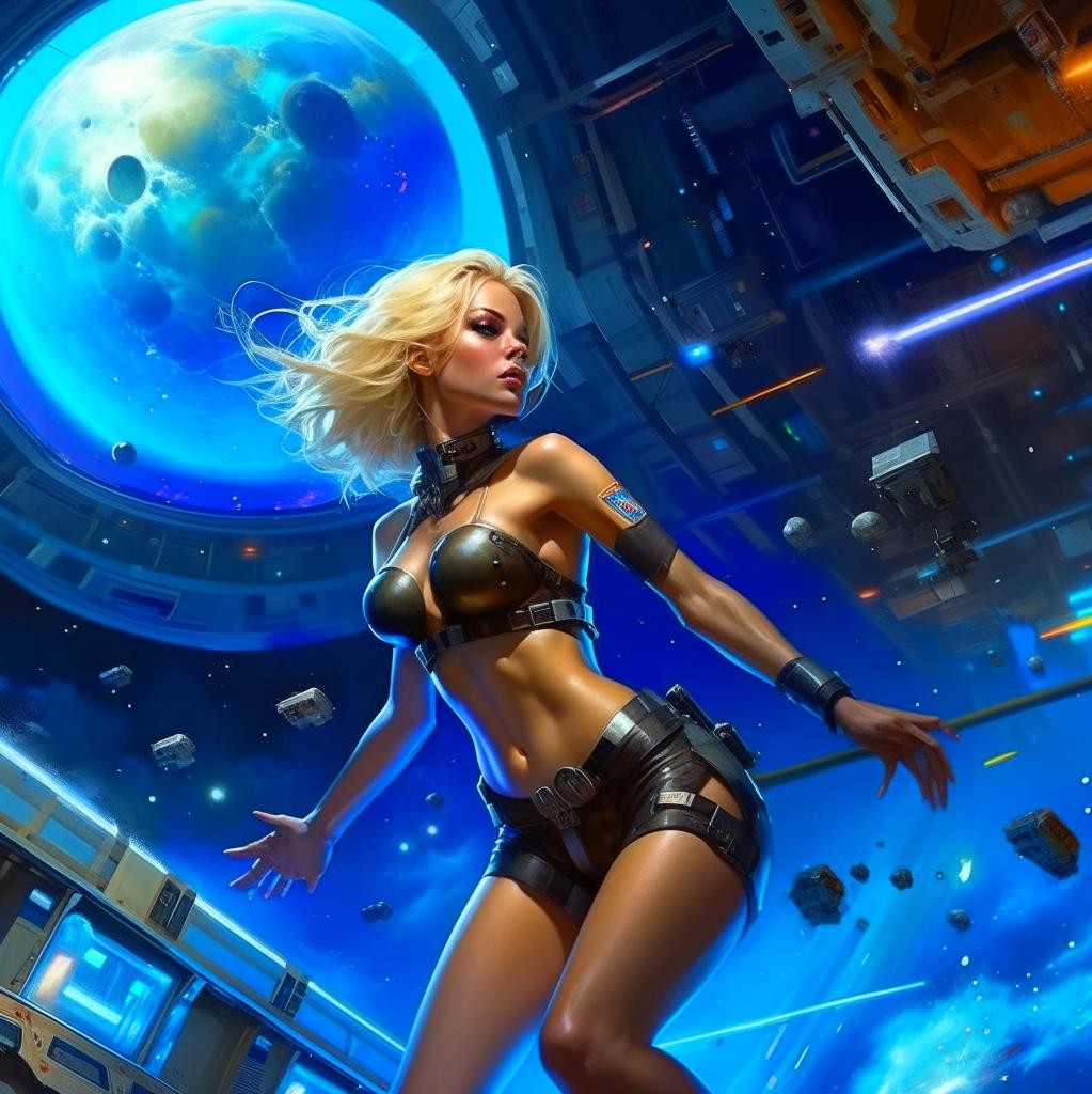 Автор: Сергей ЧеЗадал нейросеткам почти один и тот же prompt. Планеты, звезды, космический бой, корабли взрываются и все такое. На этом фоне - дама без скафандра в открытом космосе. Кандинский как всегда небрежен, лишние пальцы, лишние ноги, звезды - не звезды, а холодные резиновые игрушки.