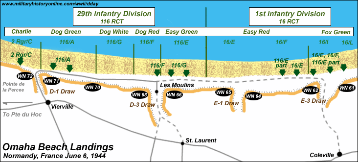Высадка на секторе "Омаха" оказалась самой кровопролитной. "Омаха" был разделён на несколько зон: Dog Green, Dog White, Dog Red, Charlie, Easy Red, Easy Green, Fox Green и Fox Red. В зоне Easy Red и Fox Green потери были самыми большими.