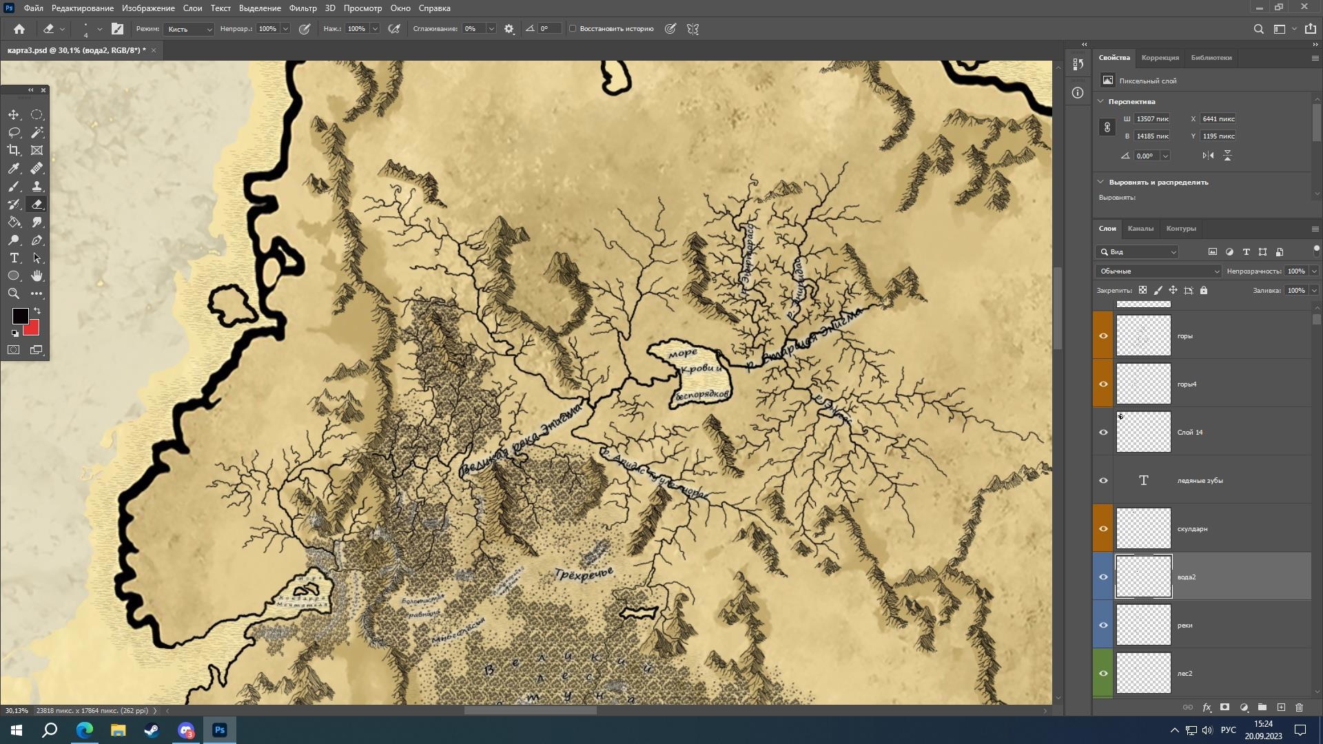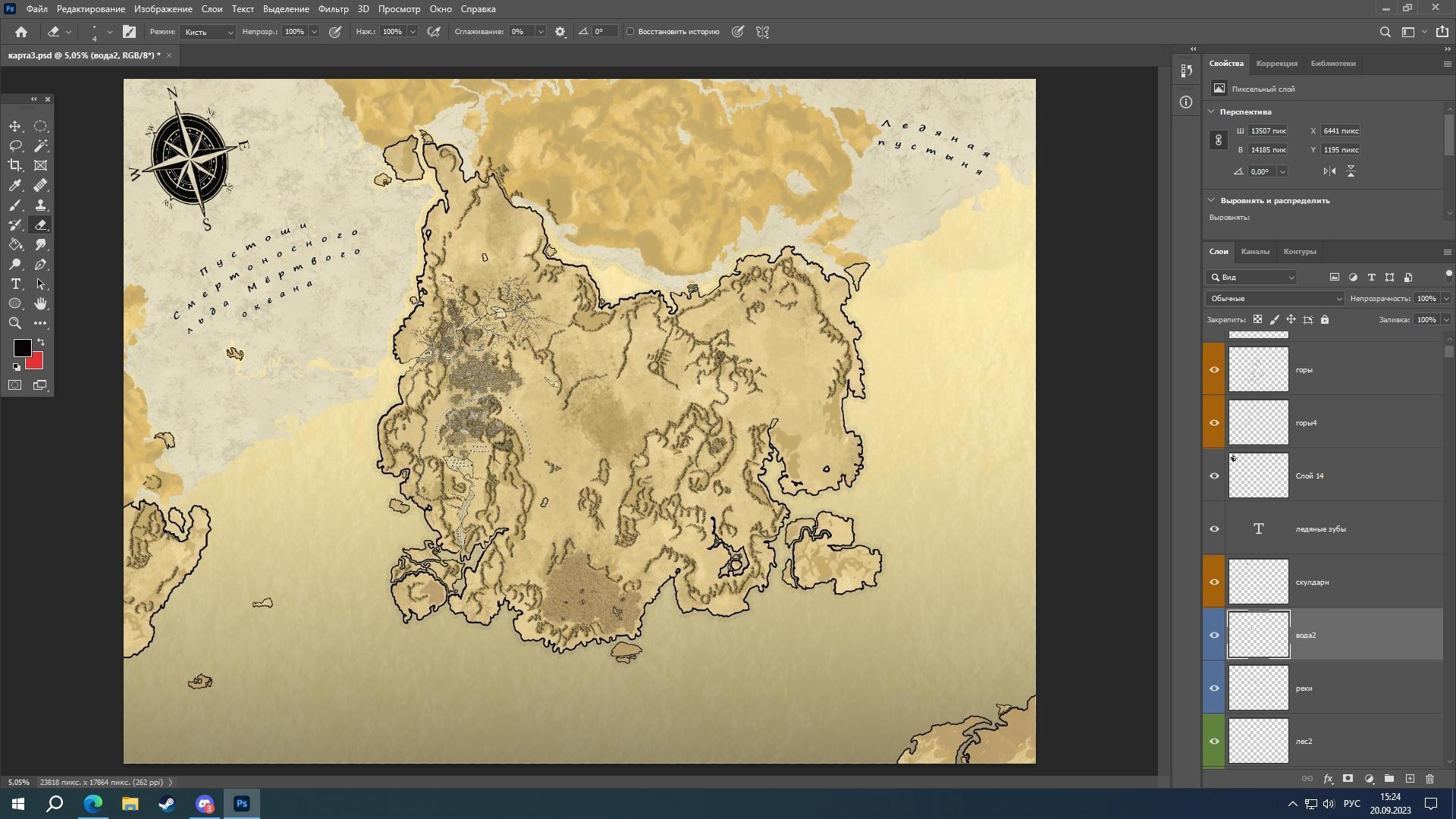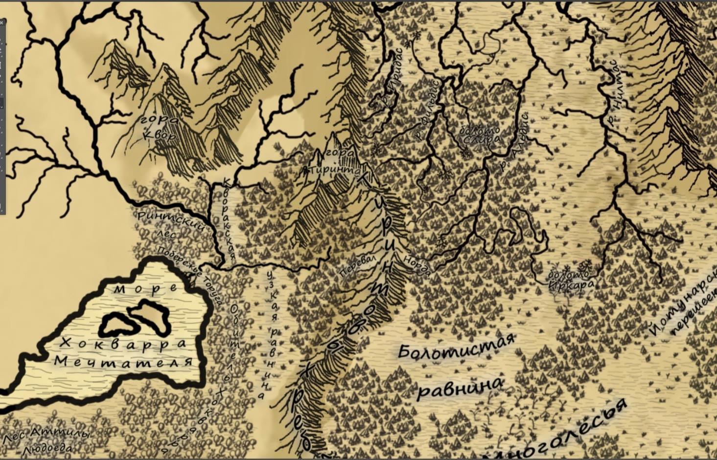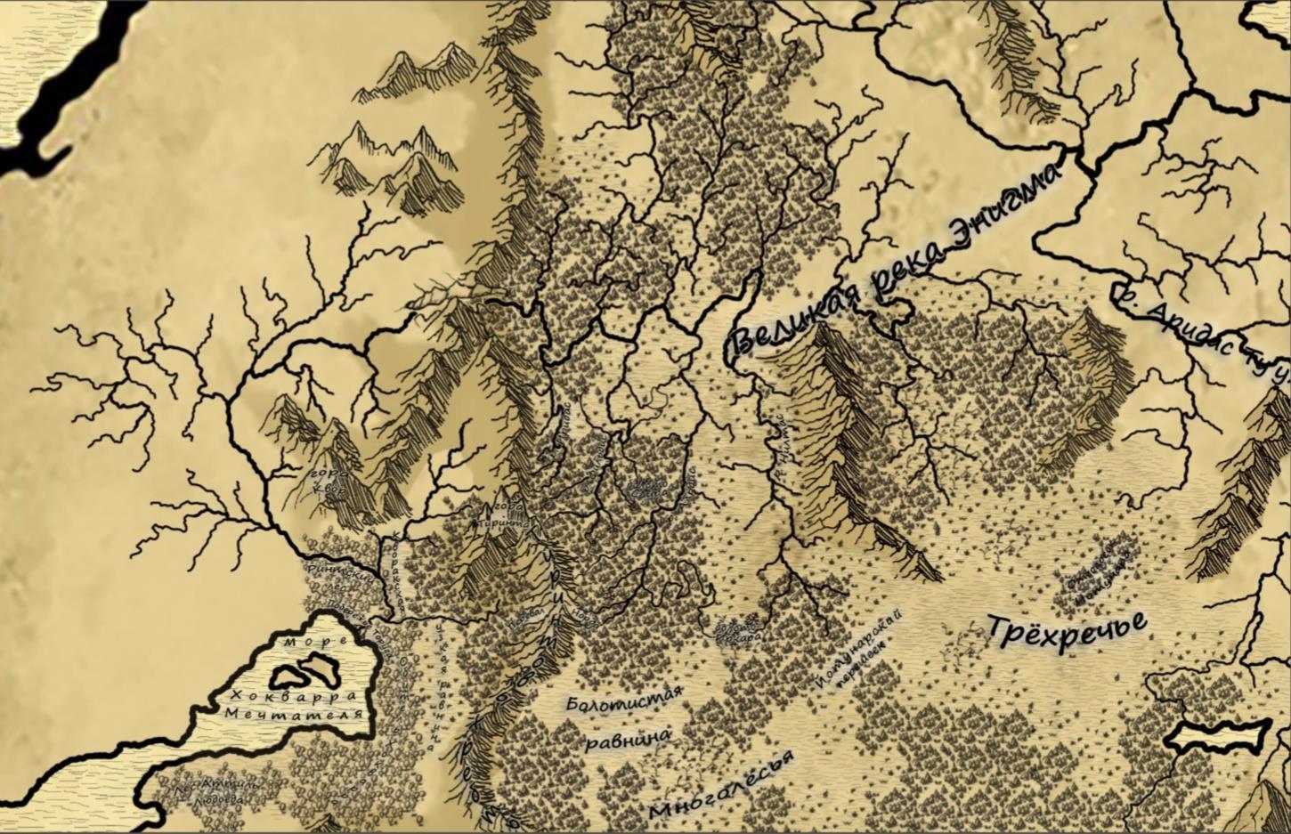 Добавил множество ледников, буквально целый океан, и сместил немного линию экватора. Также начал рисовать Энигму и пригород Кворака, попутно соединив его с местом действий первых частей книги.