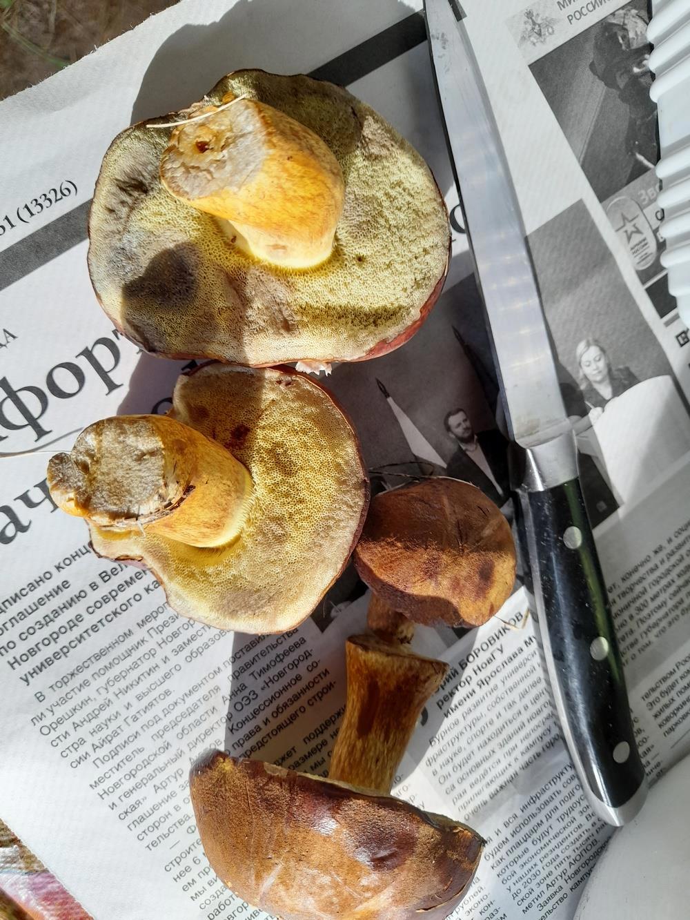 Прошу помощи у знатоков - нашли вот такие грибы, очень похожие на белые, но не совсем. При этом слегка синеют при нажатии - но не как дубовик.