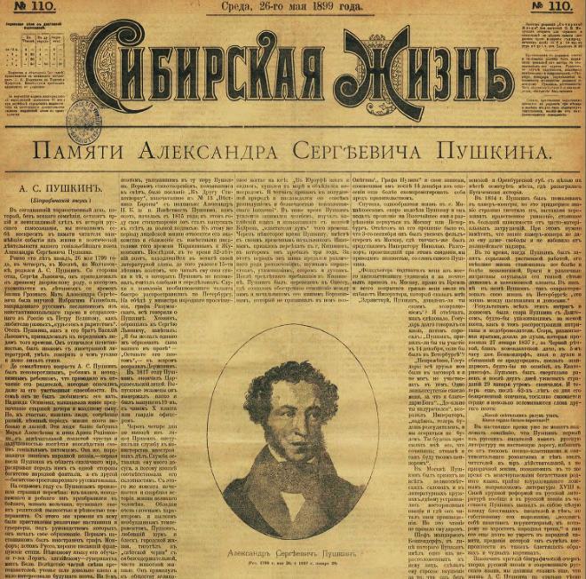 Так, например, номер 110 газеты «Сибирская жизнь» от 26 мая был весь(!) посвящен Пушкину – даже привычных рекламных объявлений на четвертой полосе не было. Случай беспрецедентный.