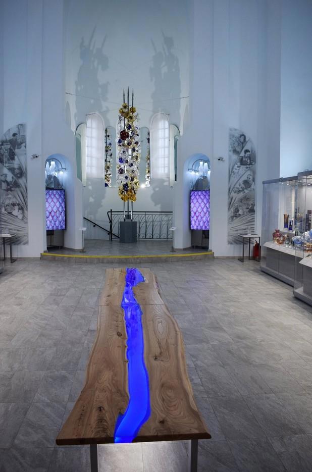 А если серьезно и без патетики, то основная идея, успешно реализованная дизайнерами при оформлении Первого Гусь-Хрустального зала — заключалась в гармоничном слиянии архитектуры и декоративно-прикладного искусства.