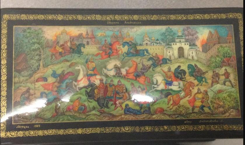 Это отличает мстерскую миниатюру от палехской, которая выполняется на черном фоне. Еще одна ее особенность – полоска тонкого золотого орнамента, обрамляющая изображения.