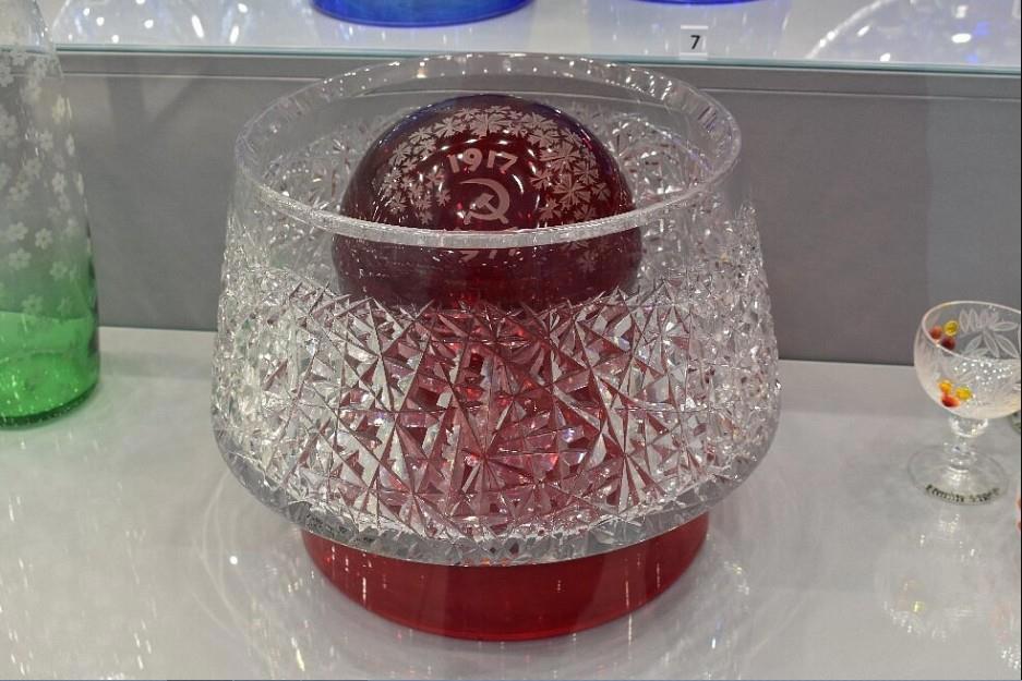 Там нас встретила не менее богатая, чем «дореволюционная», экспозиция уже сугубо современных изделий Гусевского хрустального завода. В просторном помещении экспонировалось стекло, датируемое периодом от 1918 года до наших дней.