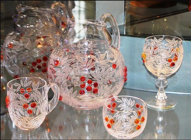Рогов Е.И. (1918 - 1999 гг.). Декоративный сервиз «Рябинка» («Спелая Рябина»). 1981 г. Хрусталь бесцветный и цветной, выдувание, техника гутная, гравировка.