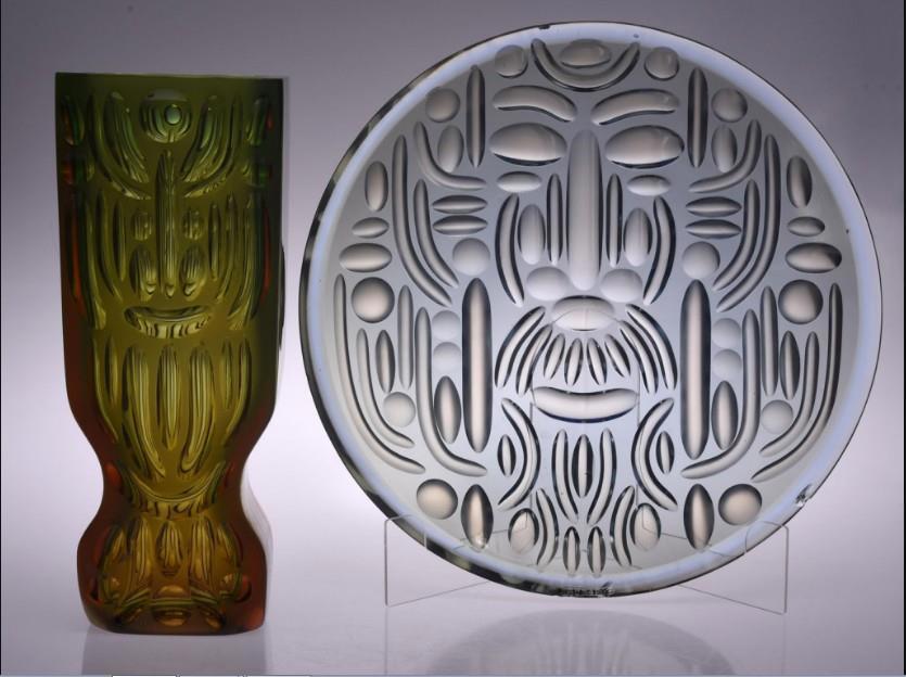 Не менее жгучий интерес и поистине неописуемый восторг (как-никак — дань исконным предкам, а не авраамическая галиматься с «куполами-крестами»!) вызвал у нас с Исой сугубо славянско-историчные Ваза и блюдо из комплекта «Перун», выполненные из цветного хрусталя. Художественная новизна комплекта заключалась в сочетании оригинальной формы и самобытного орнамента. Декоративная насыщенность узора бла достигнута за счёт наложения слоёв разноцветного хрусталя, меняющего оттенки в зависимости от толщины и глубины рисунка, который нанесён на крепкую лаконичную форму. Жаль только, что рядом с ним не было ещё одной легендарной вазы С.П. Верина «Ярило» (1968 г.) — из серии произведений, тоже посвящённых славянской мифологии.