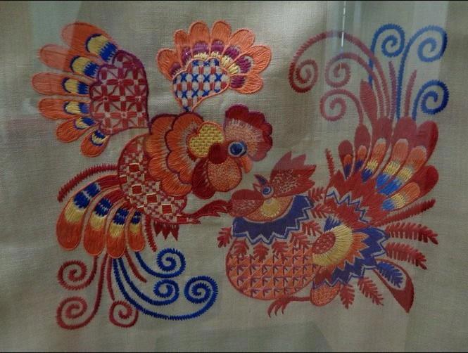 Шульпина Т.М. (1913 - 1999 гг.). Вдоль деревни. Ковер. 1969 г. Ткань смесовая, мулинэ, вышивка ручная «владимирский шов». Ерофеева Л.А. (1948 г.р.). Полотенце декоративное. 1986 г. Лен, мулинэ, вышивка ручная «владимирский шов». Шульпина Т.М. Бой петухов. Панно. 1969 г. Ткань шерстяная, мулинэ, вышивка ручная «владимирский шов»