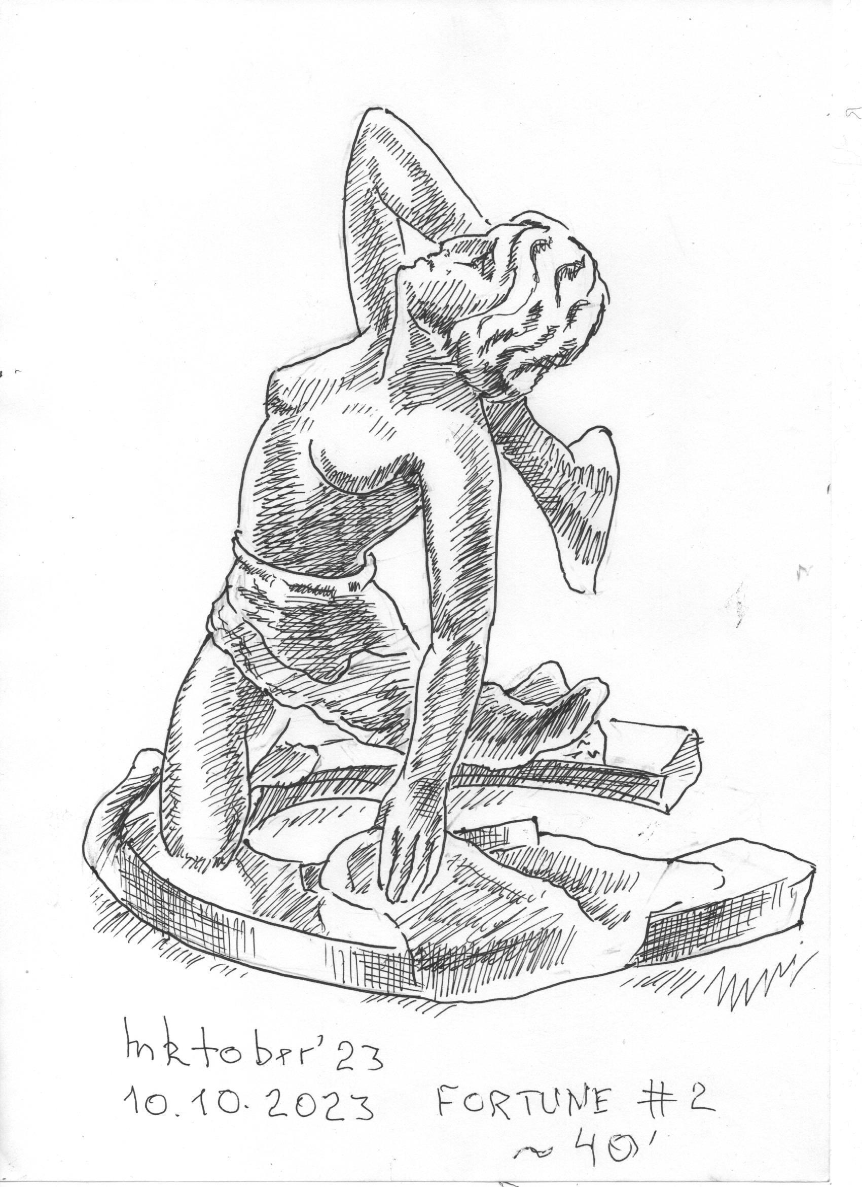 Вспомнилась статуэтка удачи — девушка на подкове с рогом изобилия на плечах. Нашел картинку, воодушевился, нарисовал, как получилось. К сожалению, других ракурсов не нашел (не сильно и искал), поэтому не все понял, что рисовал.