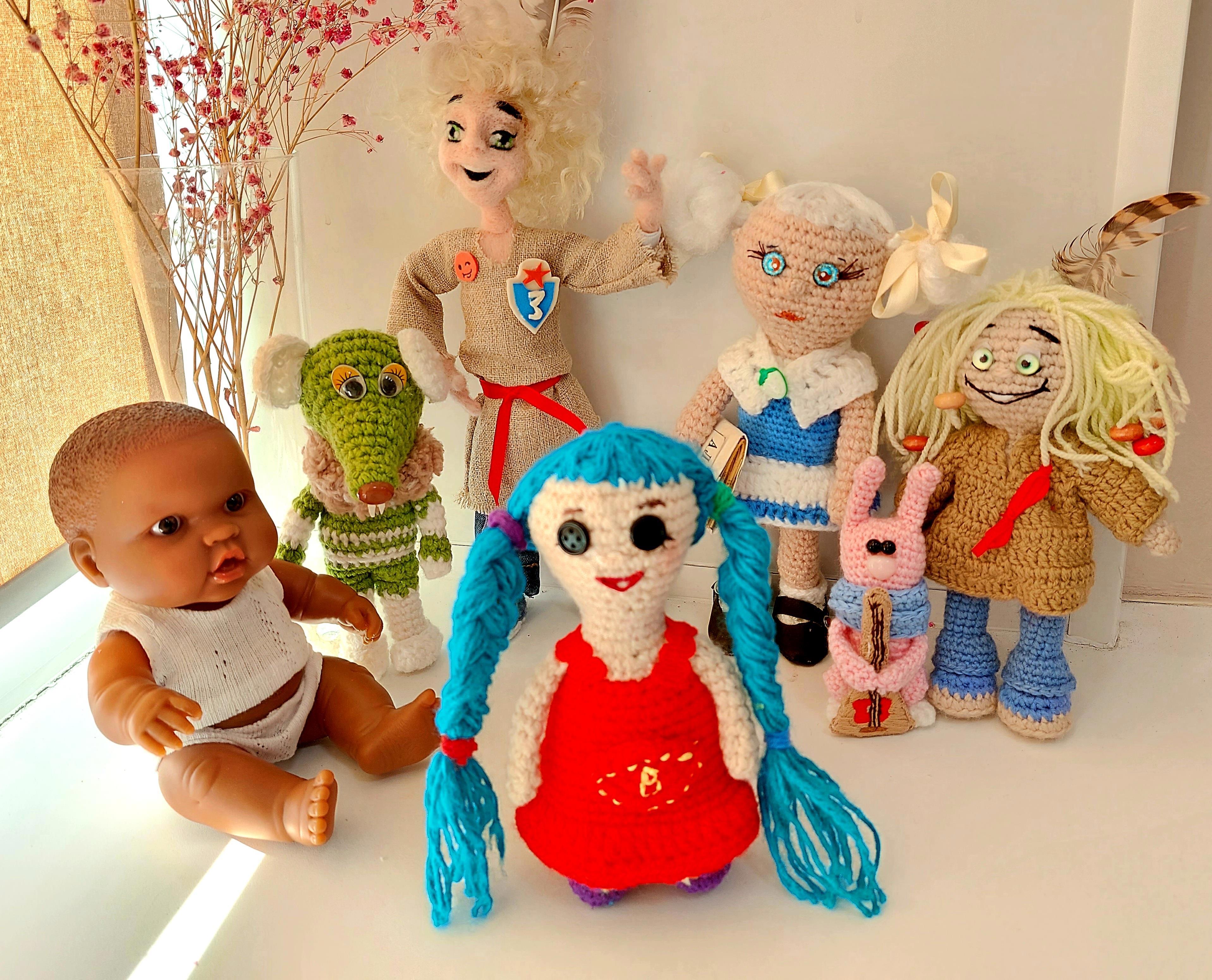 Вот так вязанная кукла Варюшка выглядит в реальности, она живёт на подоконнике в моём рабочем кабинете вместе с компанией своих друзей из сказки "Ермошка Добродей": девочкой Олей, домовёнком Ермошкой, пупсёнком Сэмми, крысёнком Куцем, Заей с бабалайкой и капризным Барабашкой...