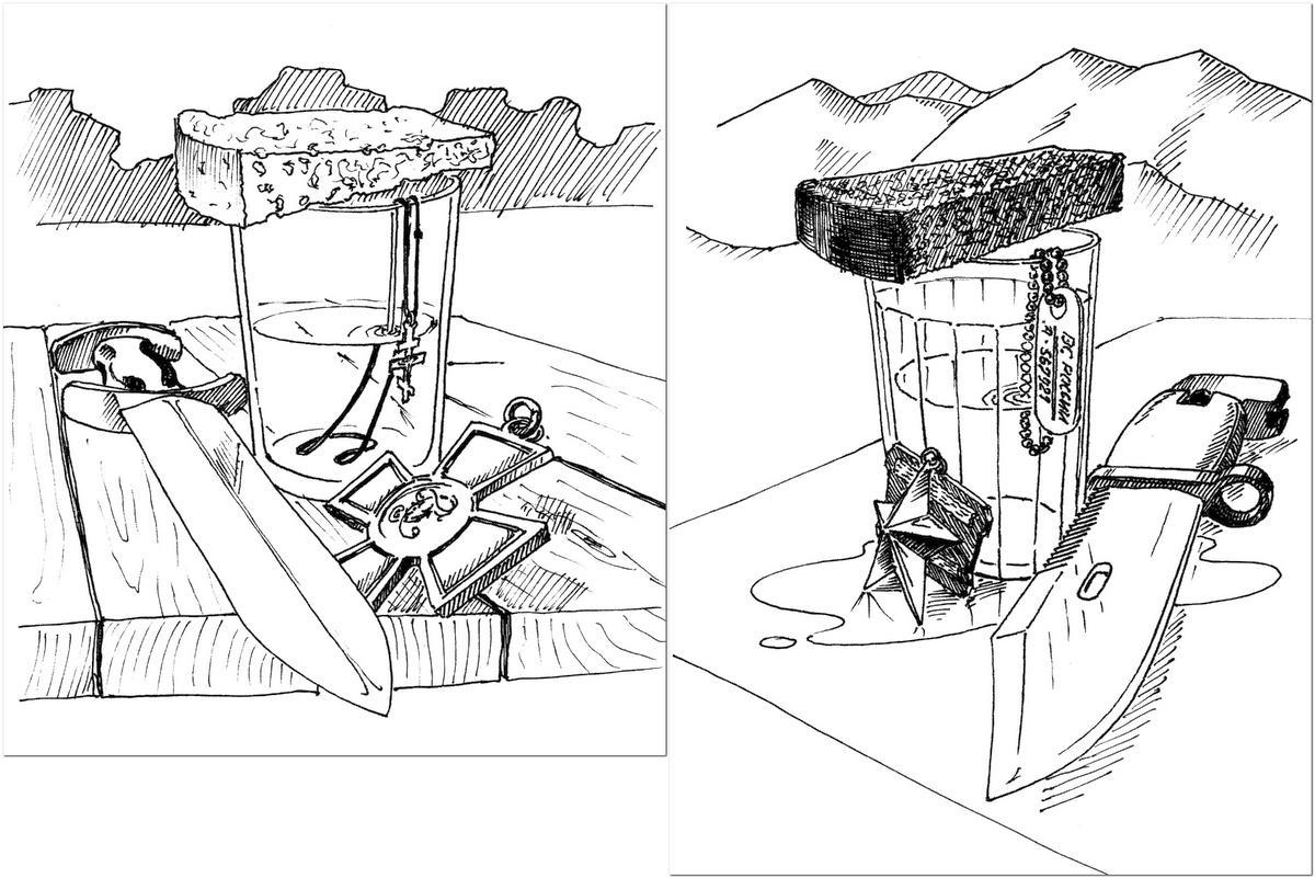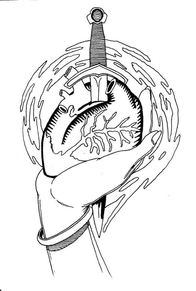 Потом поковырялся в папках и обнаружил, что рисовал кинжалы и раньше. В 2013 году, когда делал иллюстрации для рассказов и стихов в журнал RFPRO. Проколотое сердце для стихов Верены, а стаканы с водкой для рассказа о войне на Кавказе.