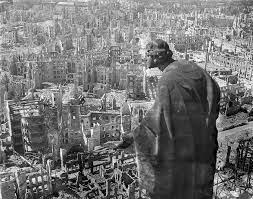 А вот так выглядит город после огненного шторма - когда стоят пустые выгоревшие коробки. Если смотреть со стороны - так вроде как дома целые. А на деле - пустые скелеты.