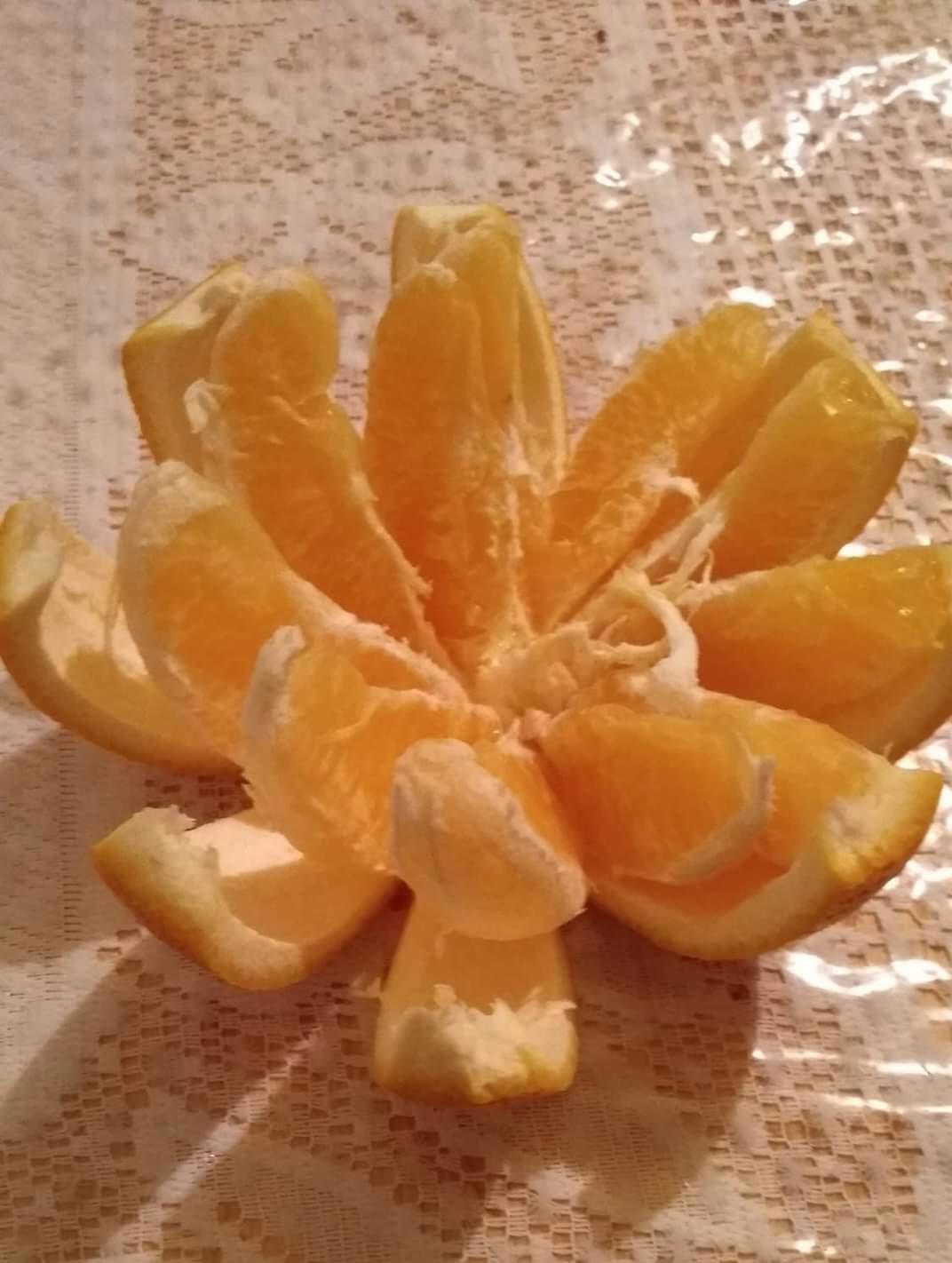 Но главное, что угол этой огромной простыни с чертежами, придавила тарелка, на которой в утреннем свете красовался ярко-оранжевый цветок лотоса с острыми лепестками.Это раскрылся апельсин, золотой шкуркой и всеми своими дольками, напоминавший сказочный ароматный цветок!