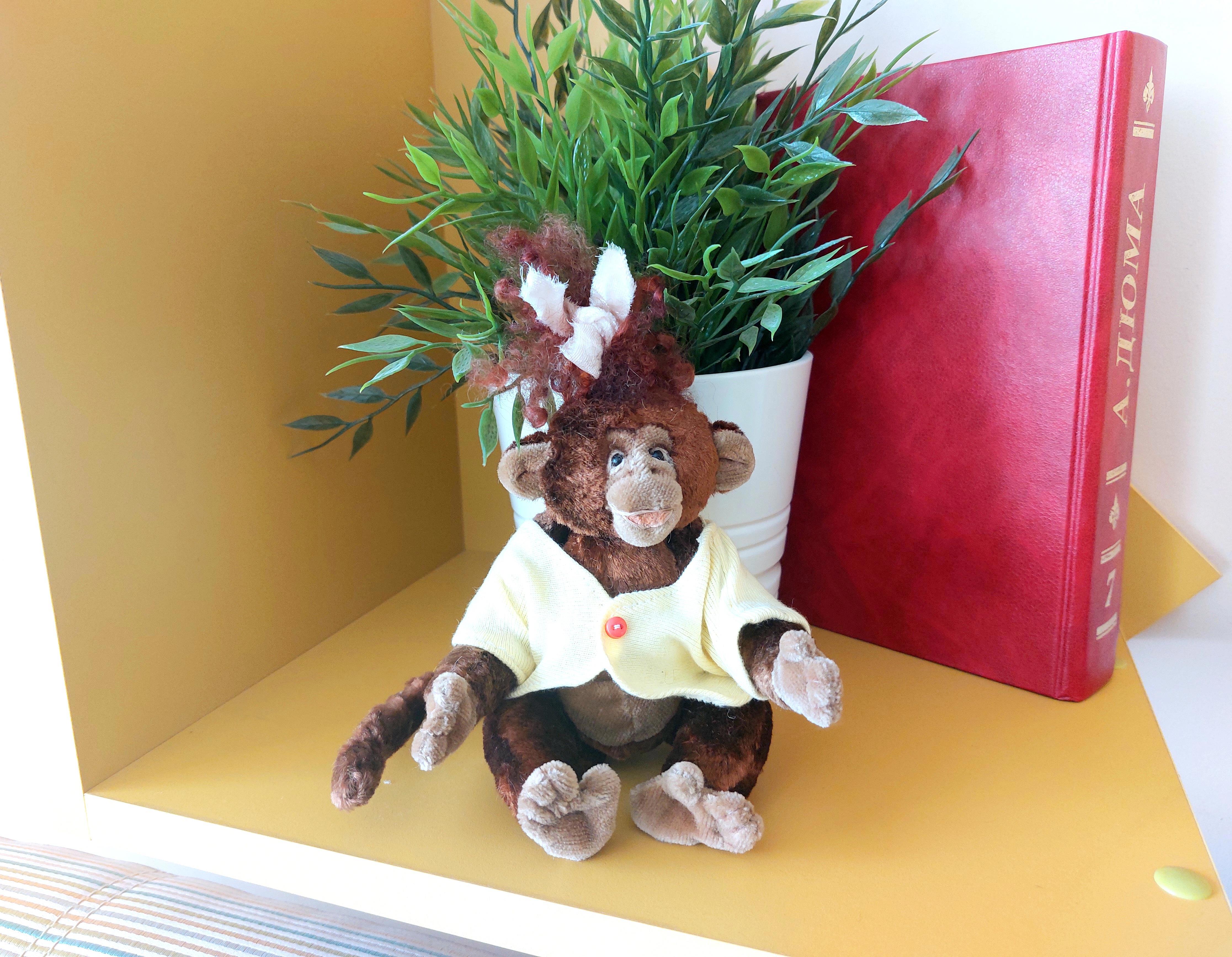 Обезьянка изготовлена по сшиты по выкройке 1947 года Анастасии Изыргиной, стоявшей у истоков создания старых советских плюшевых игрушек (помните же её самого известного советского мишку, у которого двигались голова и лапки?).