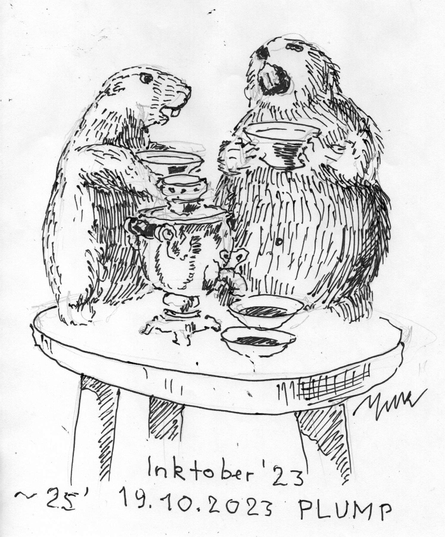 Думал о малышах, но их трудно нарисовать так, чтобы умилиться. Вспомнил о Кустодиеве. Его "Купец в шубе", "Красавица", "Русская Венера" подходят идеально. Но срисовывать их маркером мне все равно, что напевать Карузо. И тут вспомнил пару сурков, которые гоняли чаи в Костанае в 2010 году. Не знаю, выставляют ли тот столик на улицу сейчас...