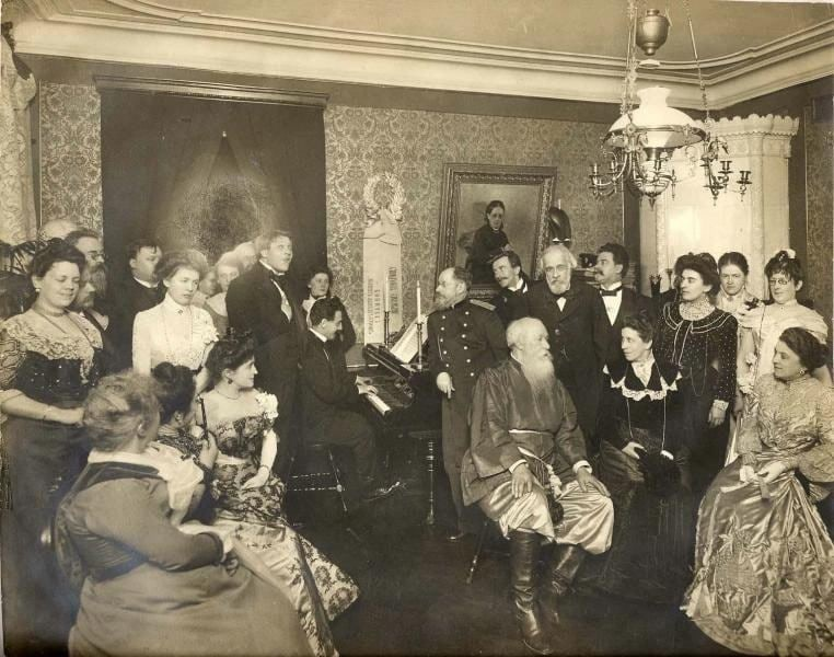 Восемнадцатая глава (пишу прямо сейчас) в немалой степени посвящена квартирникам. Чтобы читатель не подумал, что ушлый автор тянет в текст очередной анахронизм, спешу заверить: хотя бы с квартирниками в описываемое время (как и задолго до него) все было в полнейшем порядке. Вот, к примеру, фотография с домашнего концерта у Владимира Стасова, выступает Фёдор Иванович Шаляпин. Это 1904 год.