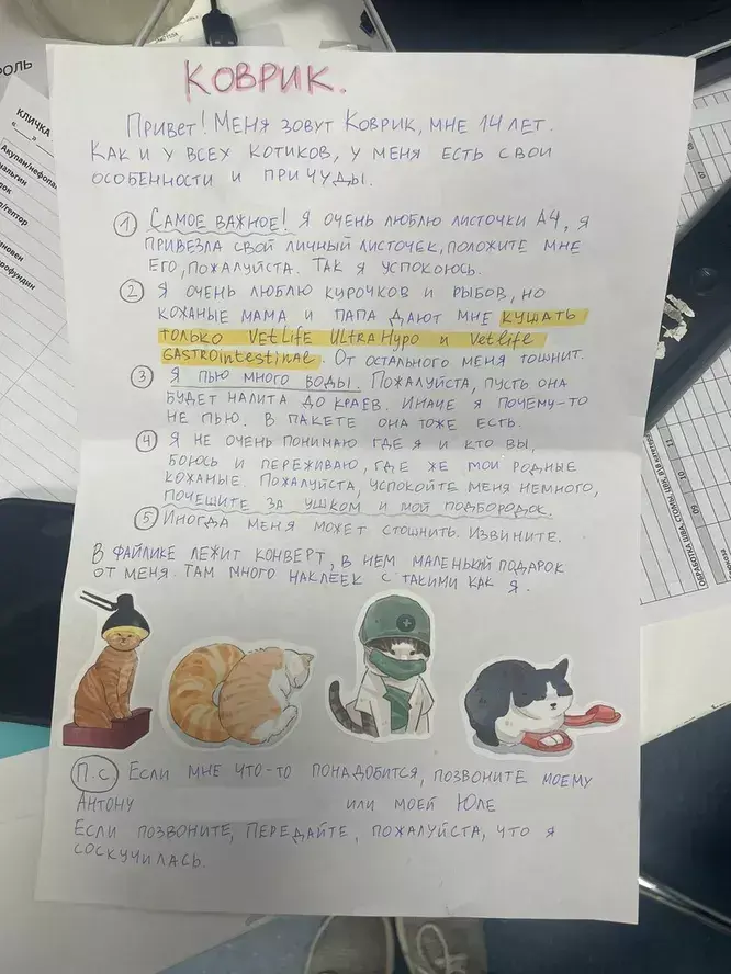"В московскую ветклинику «Биоконтроль» поступила кошка по кличке Коврик. Ее хозяева оставили ветеринарам трогательную инструкцию, чтобы животное легче перенесло временную разлуку.