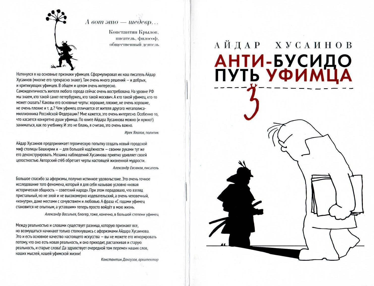 "Путь уфимца" Айдара Хусаинова - это сборник забавных (иногда философских, иногда спорных и провокационных) афоризмов, которые чаще всего начинаются со слов "Когда уфимец..." и характеризуют уфимца как некий особый социальный вид горожанина, думаю, это попытка создать некую современную мифологию своей малой родины. Это "научно"-юмористическое (а иной раз и сатирическое) исследование уфимца как особенного человека, у которого автор находит всё новые и новые признаки, отличающие его от всего остального человечества...