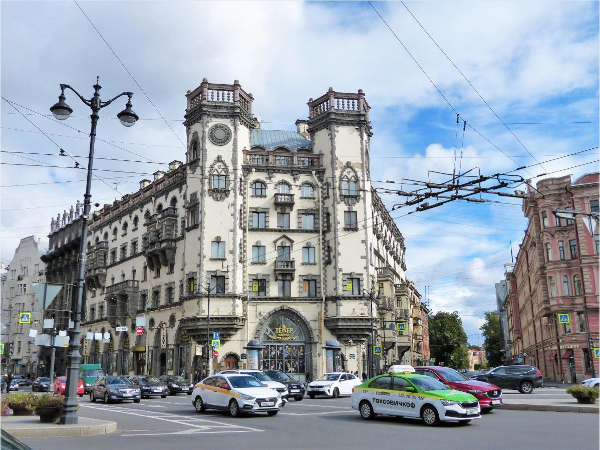 Автор: Д. В. АмурскийЕсли же от сквера имени композитора Андрея Павловича Петрова пройти ещё немного на северо-запад, то на площади Льва Толстого можно увидеть очень красивое здание, так называемый "Дом с башнями". На мой взгляд, это архитектурная доминанта всего Каменноостровского проспекта.