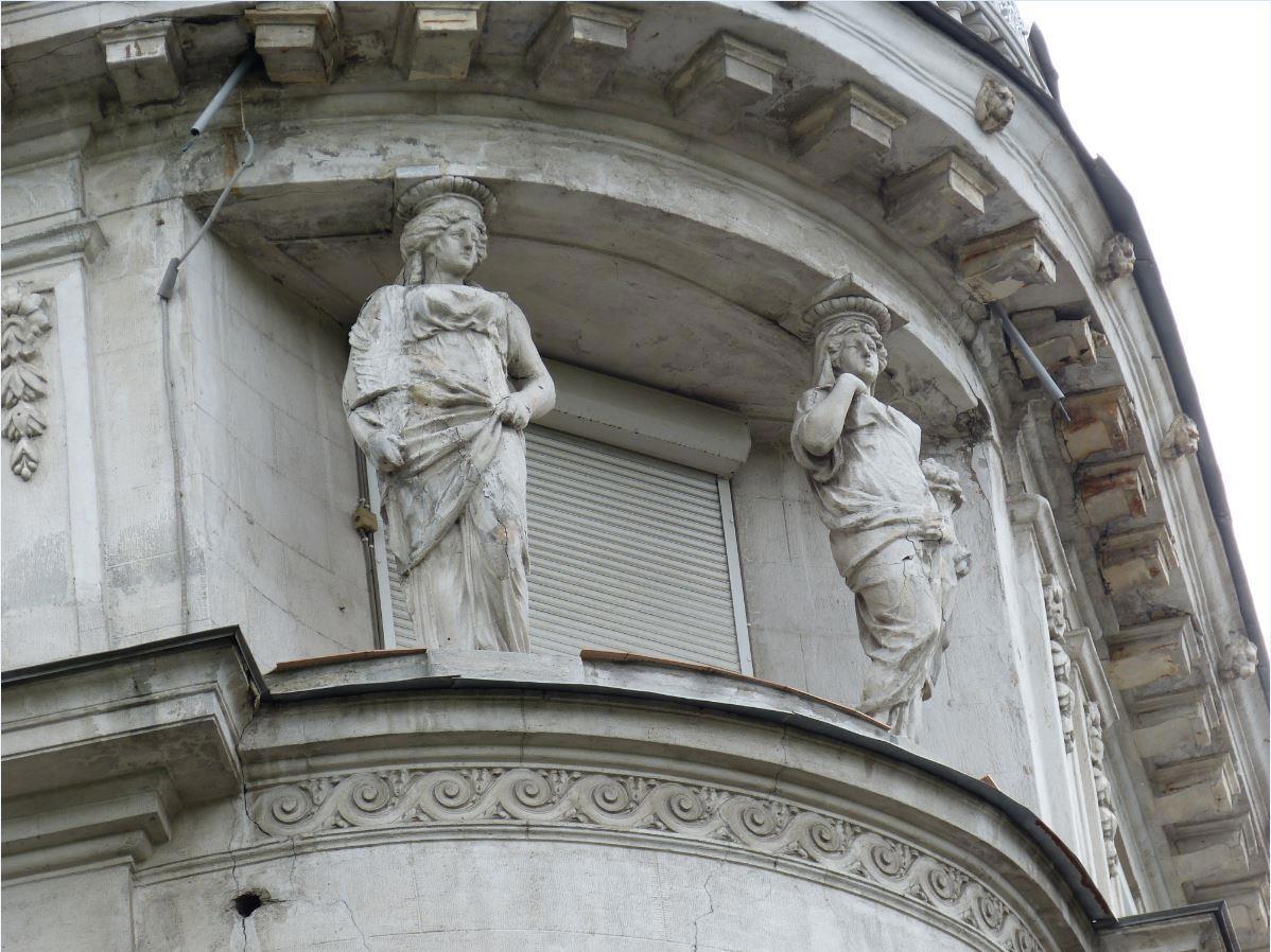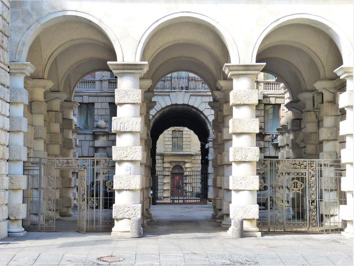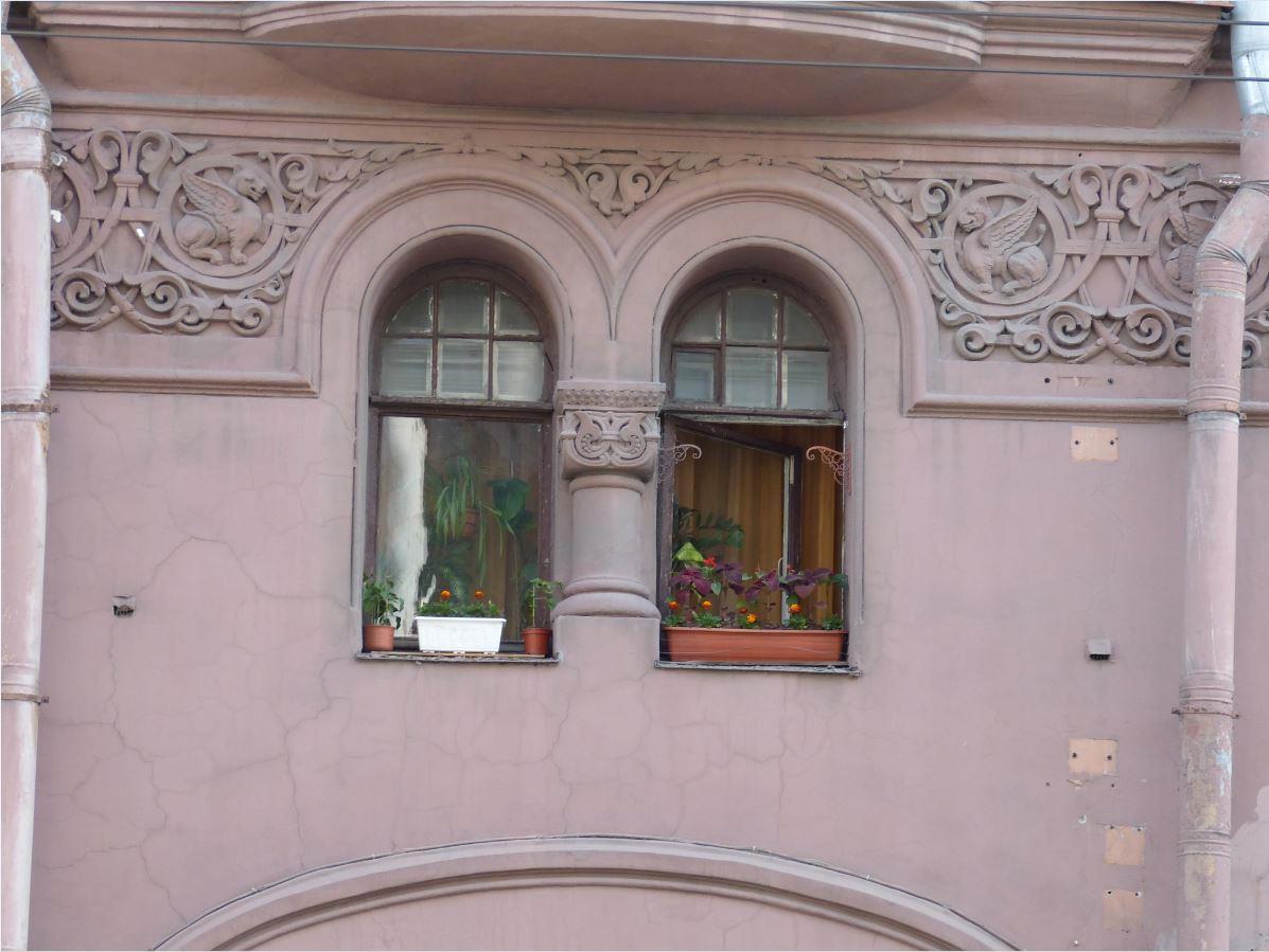 Казалось бы, ничего особенного, но посмотрите на аркатурно-колончатый пояс на пятом этаже. Это такая явная отсылка к романской архитектуре. И грифоны на барельефах...