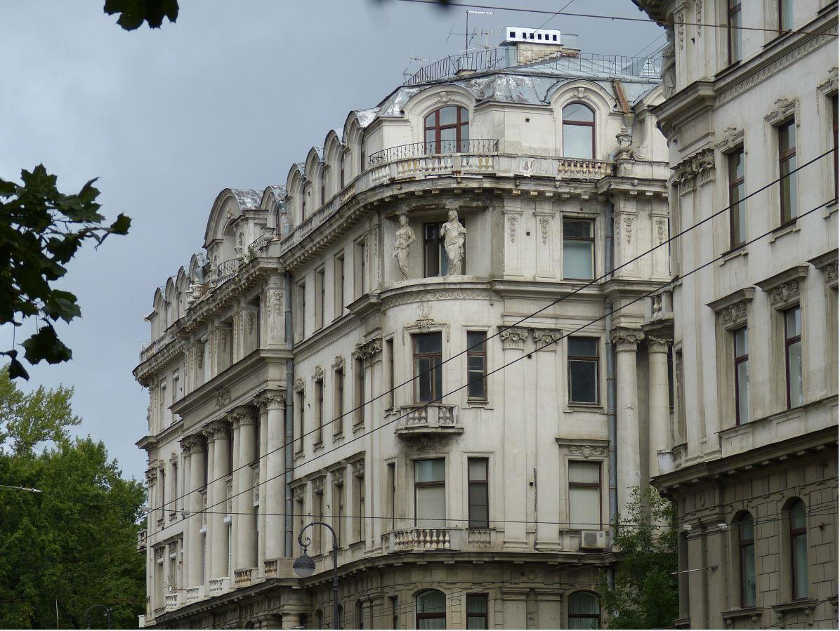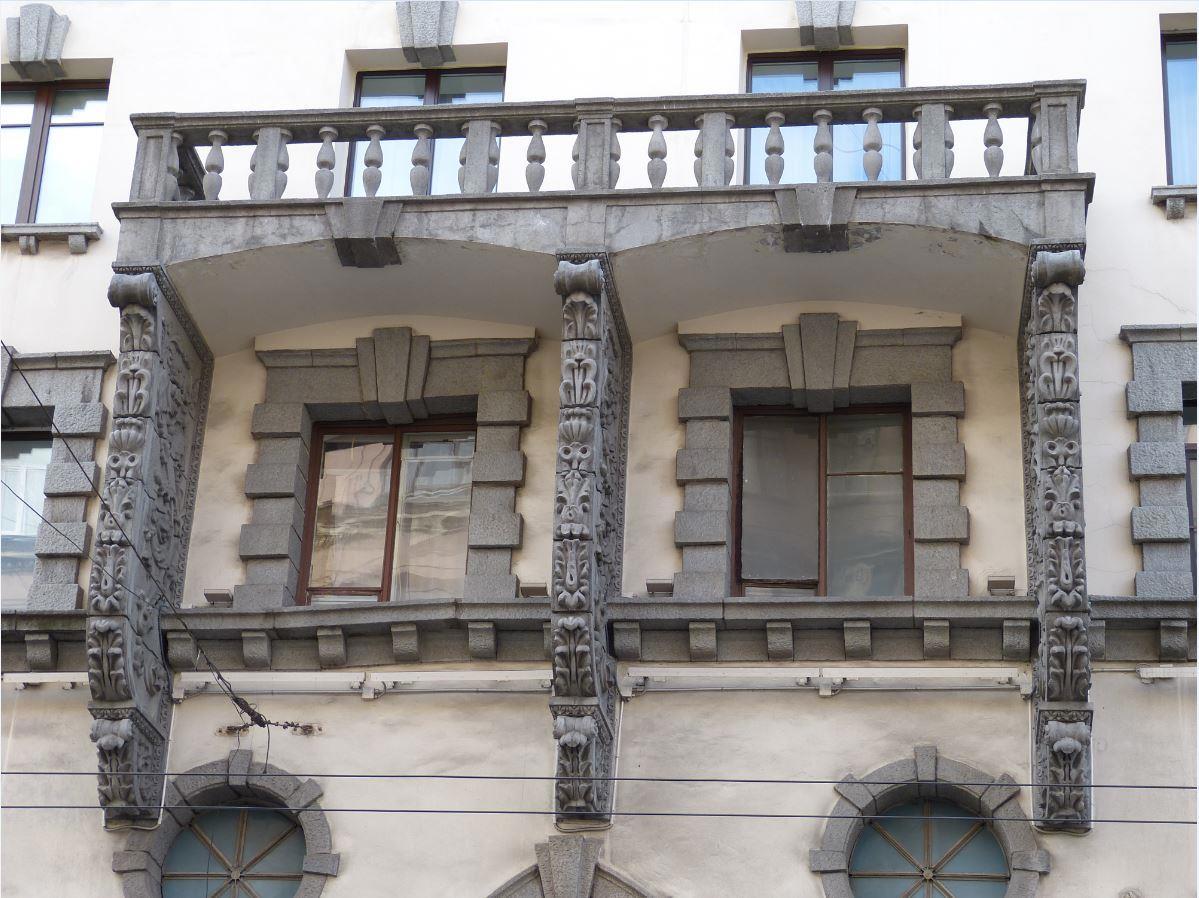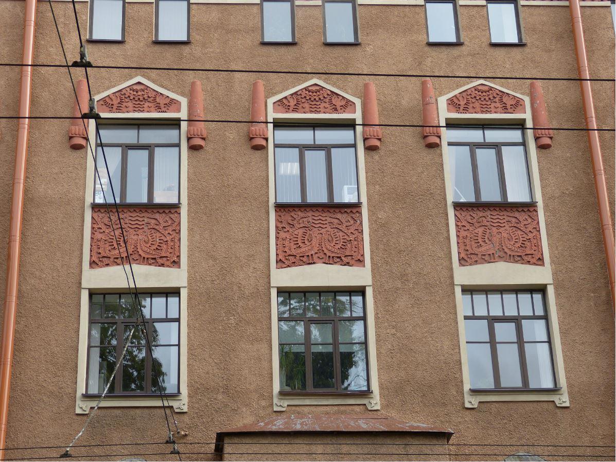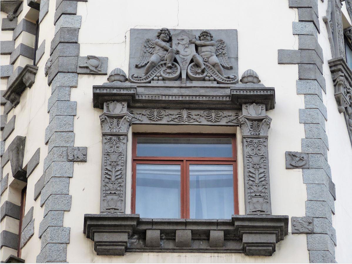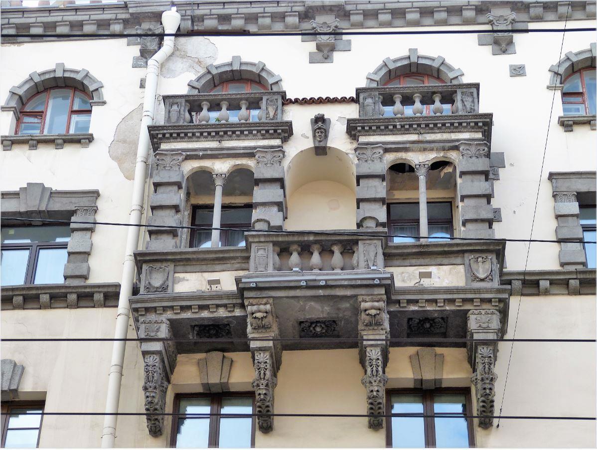 А это доходный дом Артура Фёдоровича Циммермана, построенный Фёдором Ивановичем Лидвалем в 1906 — 1907 годах, и позднее расширенный Андреем Фёдоровичем Нидермейером в 1913 году.