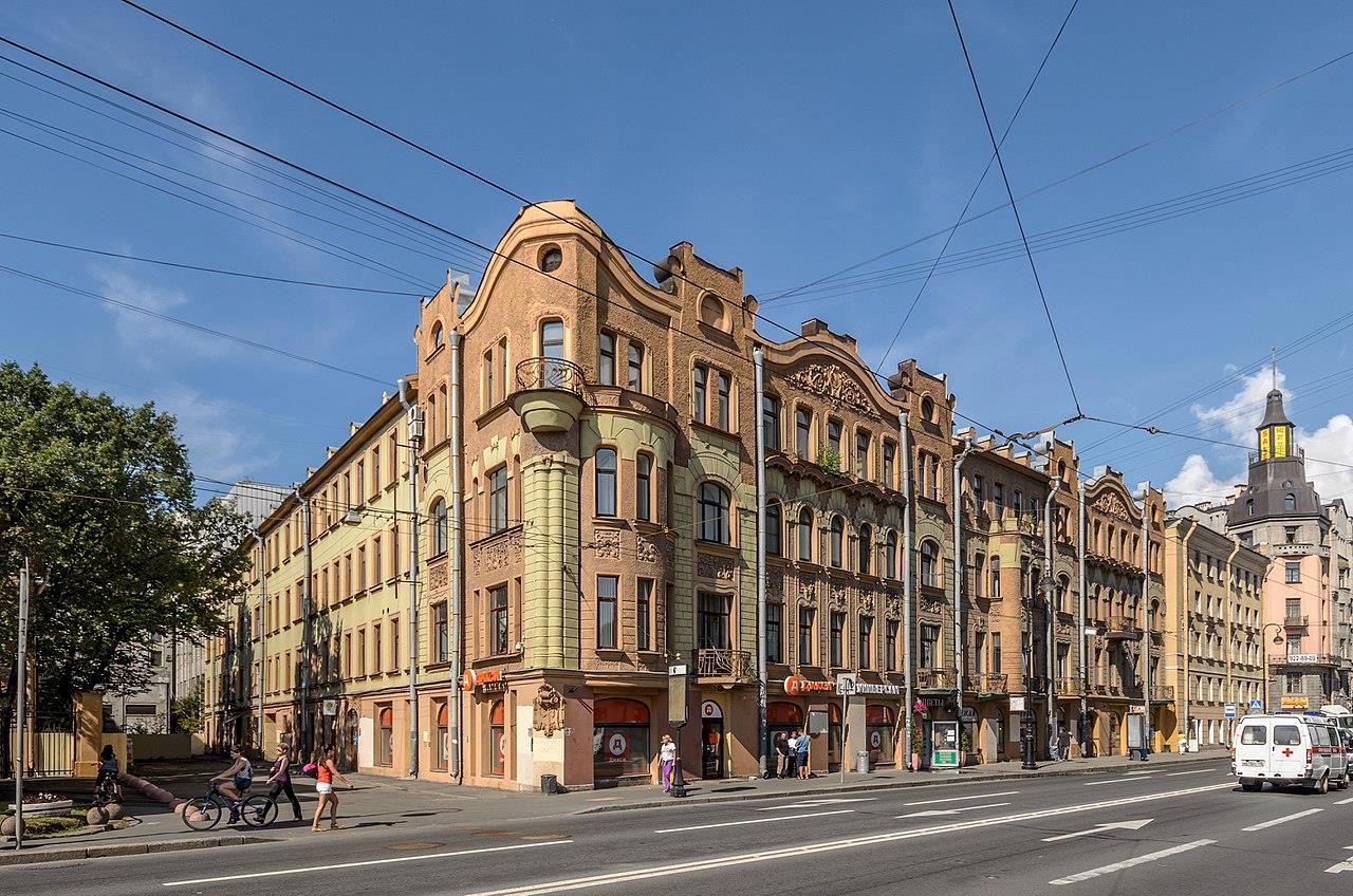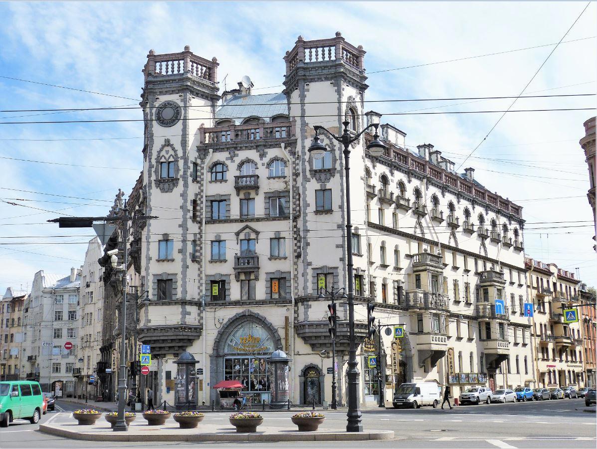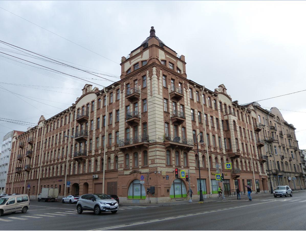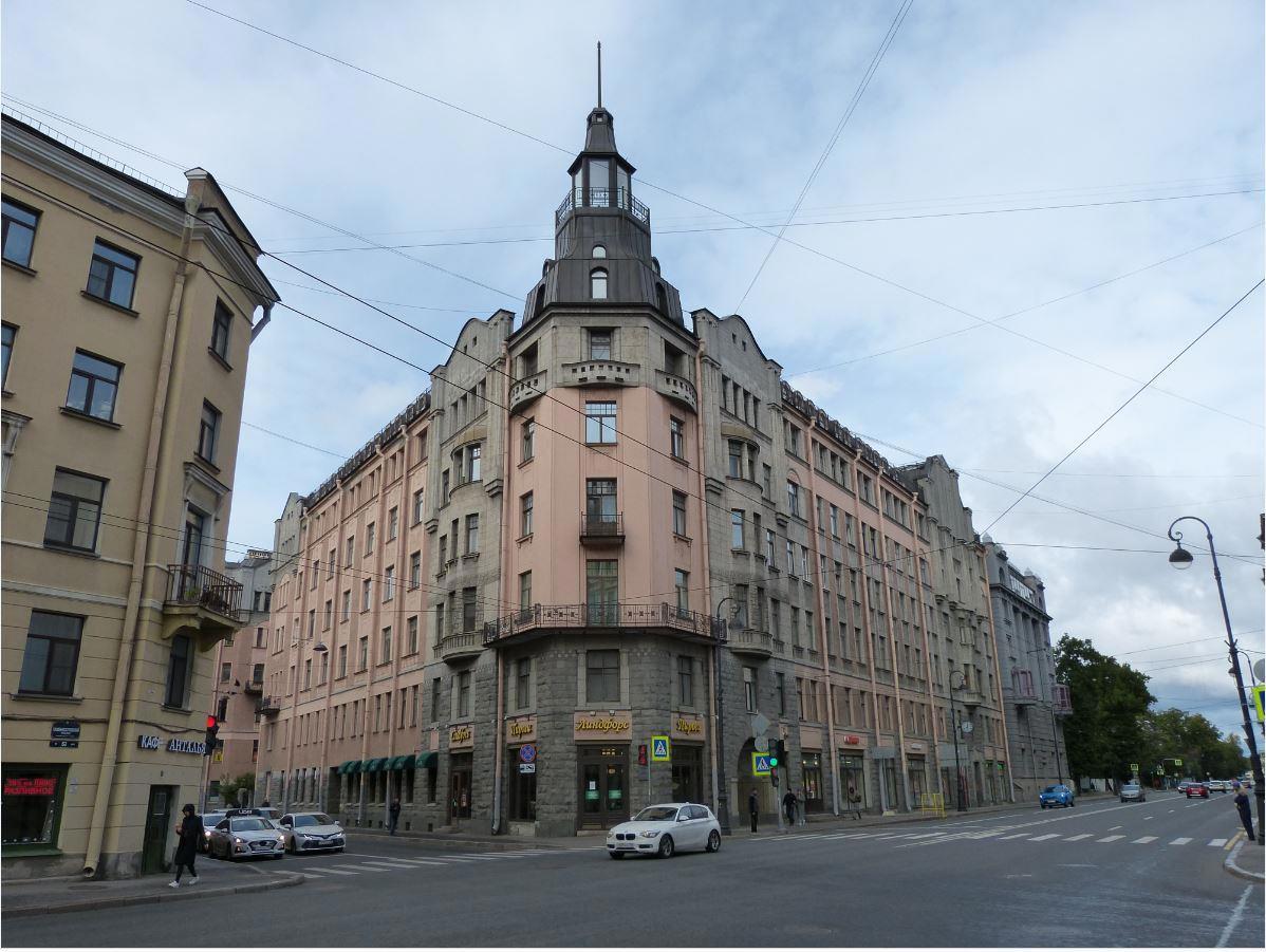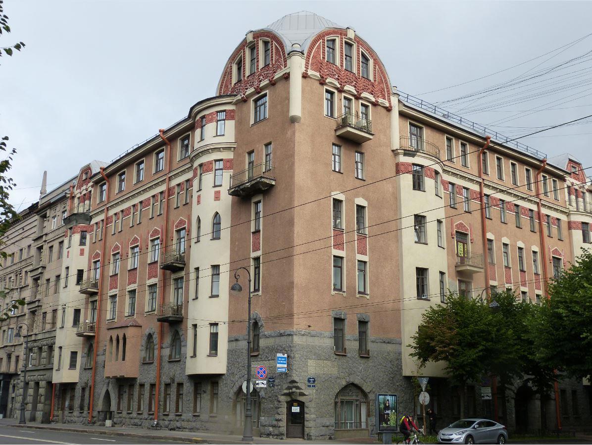 На противоположной стороне проспекта можно увидеть доходный дом, построенный в 1903 или 1906 году архитектором Дмитрием Андреевичем Крыжановским.