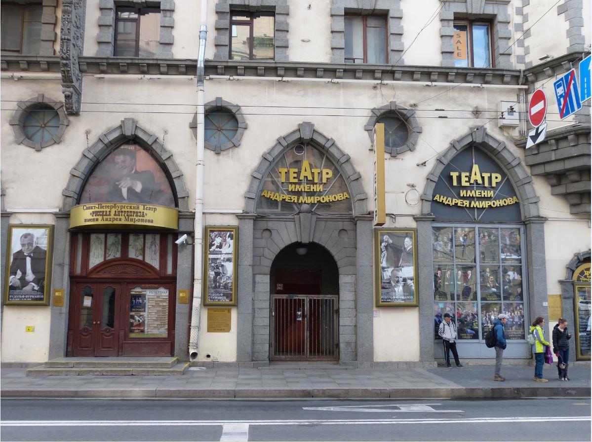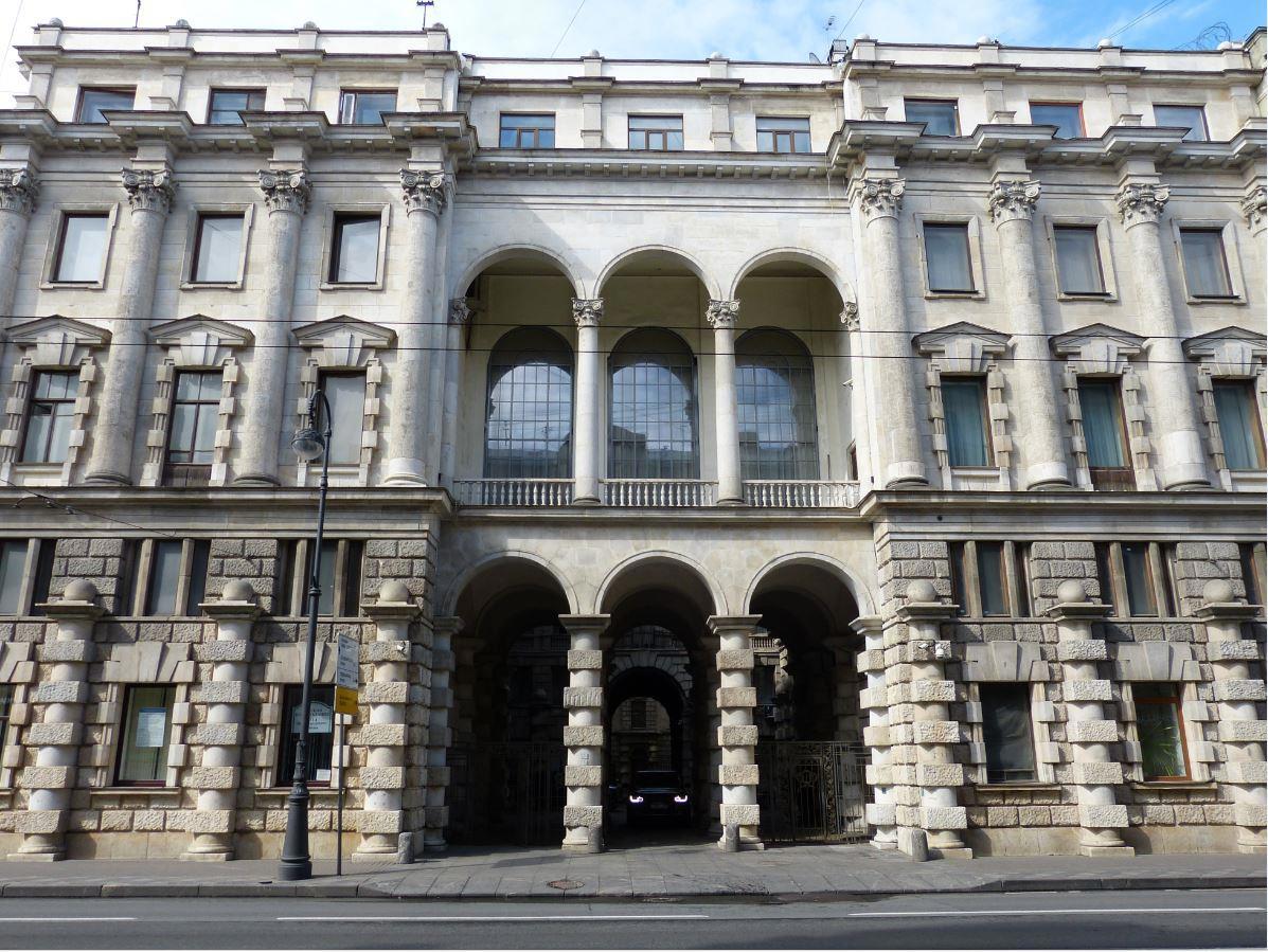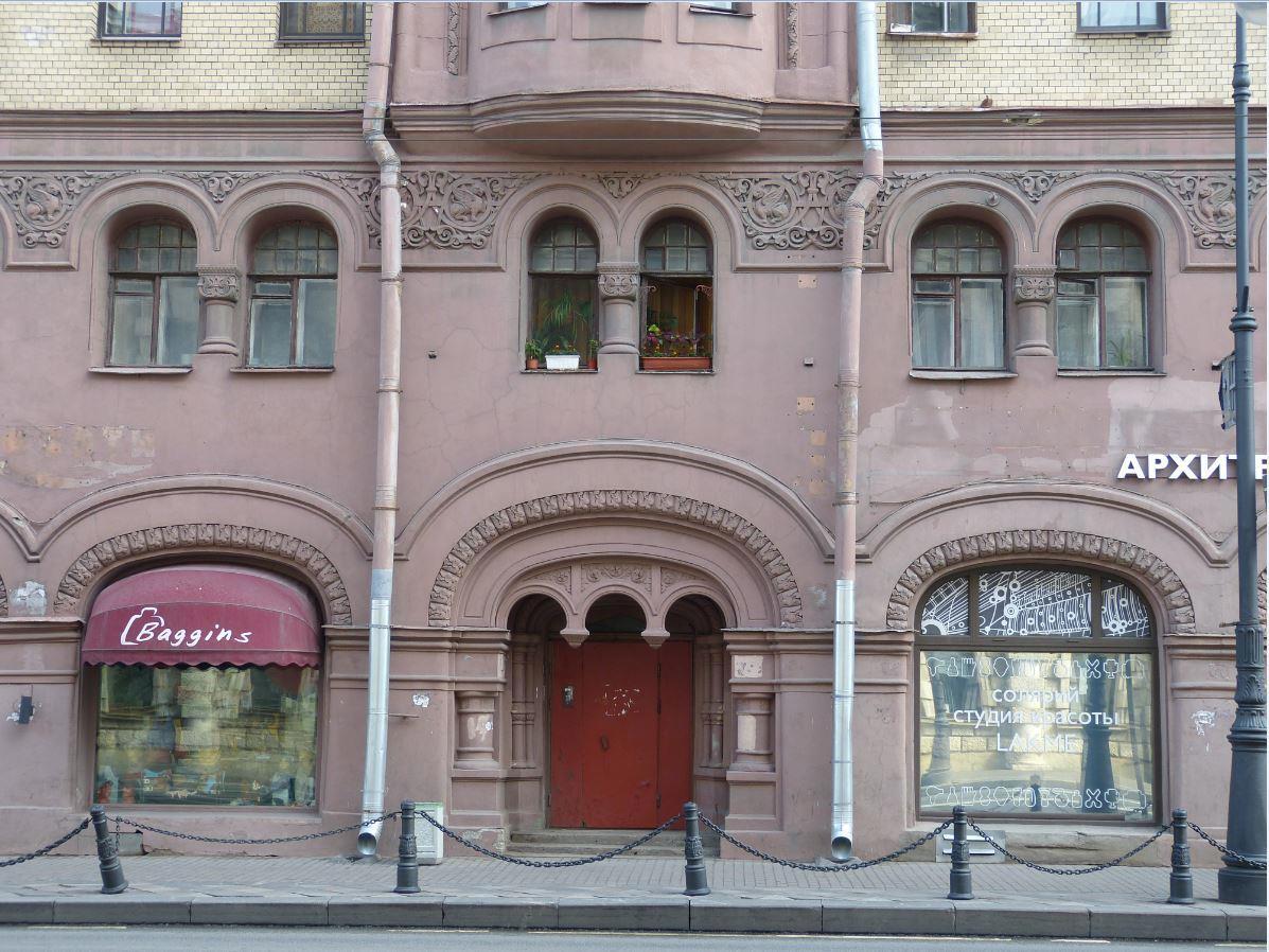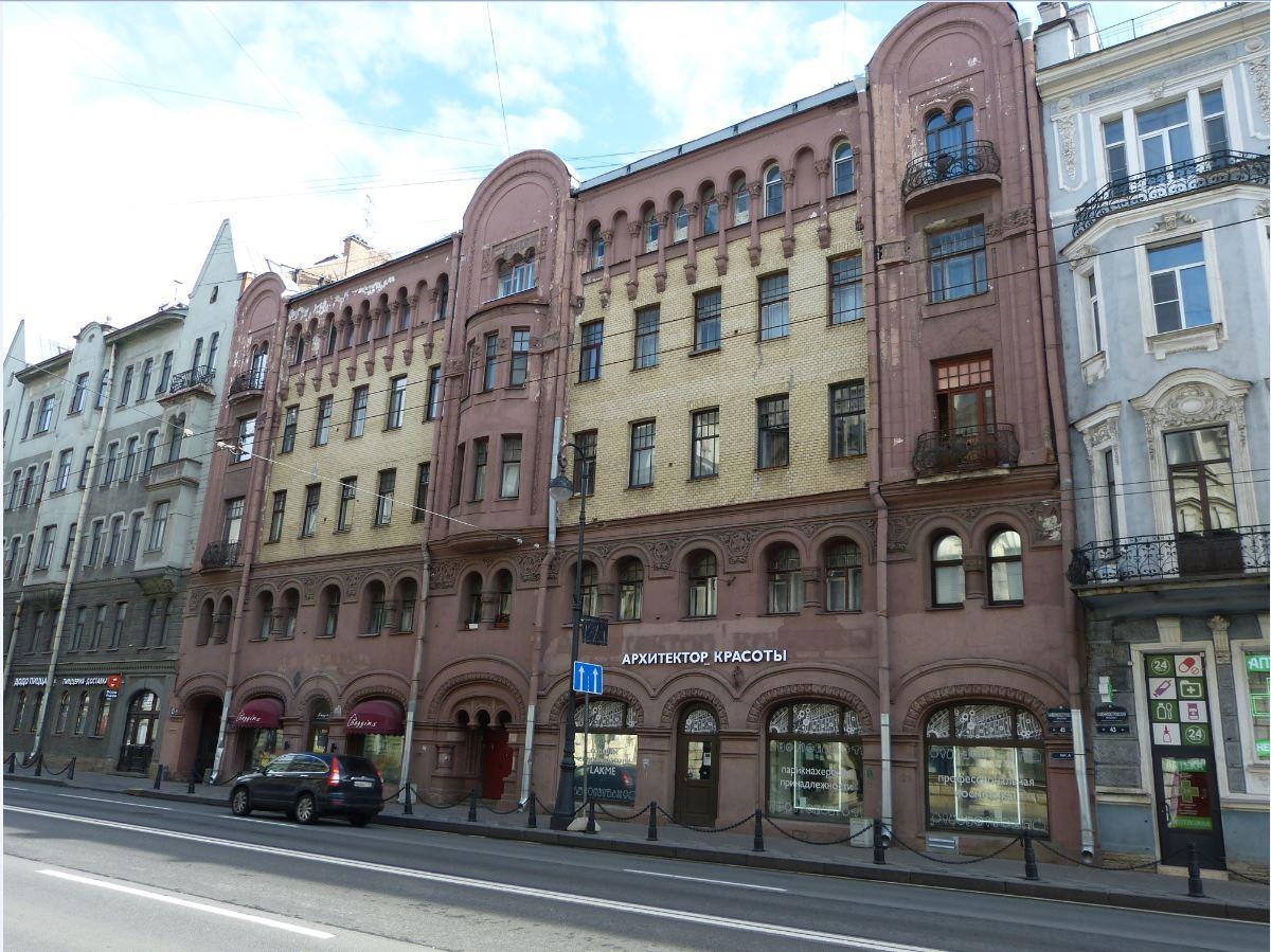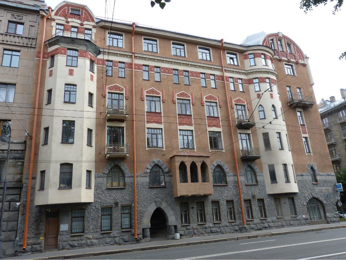 На противоположной стороне проспекта можно увидеть доходный дом, построенный в 1903 или 1906 году архитектором Дмитрием Андреевичем Крыжановским.