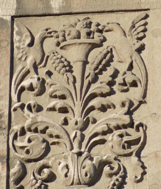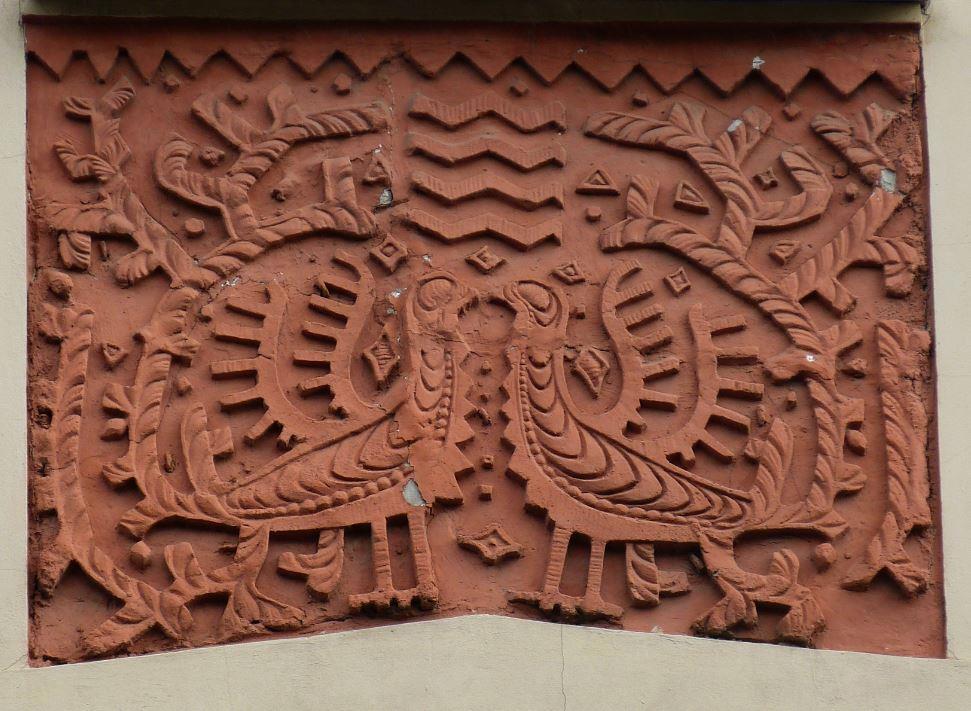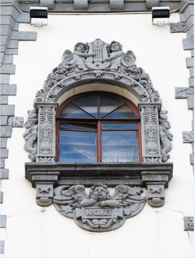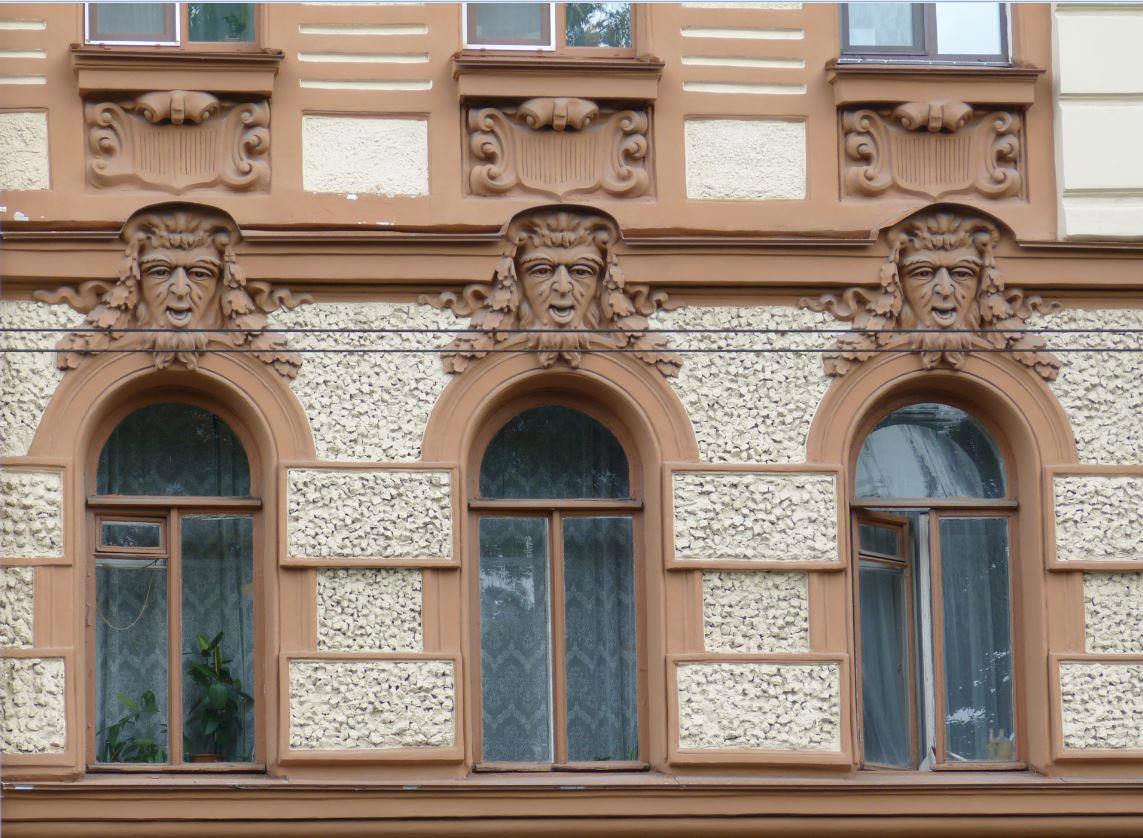 Но если присмотреться, то видно, что фасад дома украшен резьбой по камню.