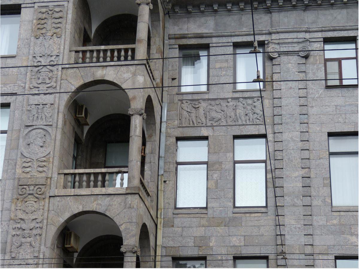 Жилой дом работников Всесоюзного института экспериментальной медицины привлекает взгляд своим декором, немного отличающимся от традиционной советской символики или традиционных изображений рабочих с колхозницами.