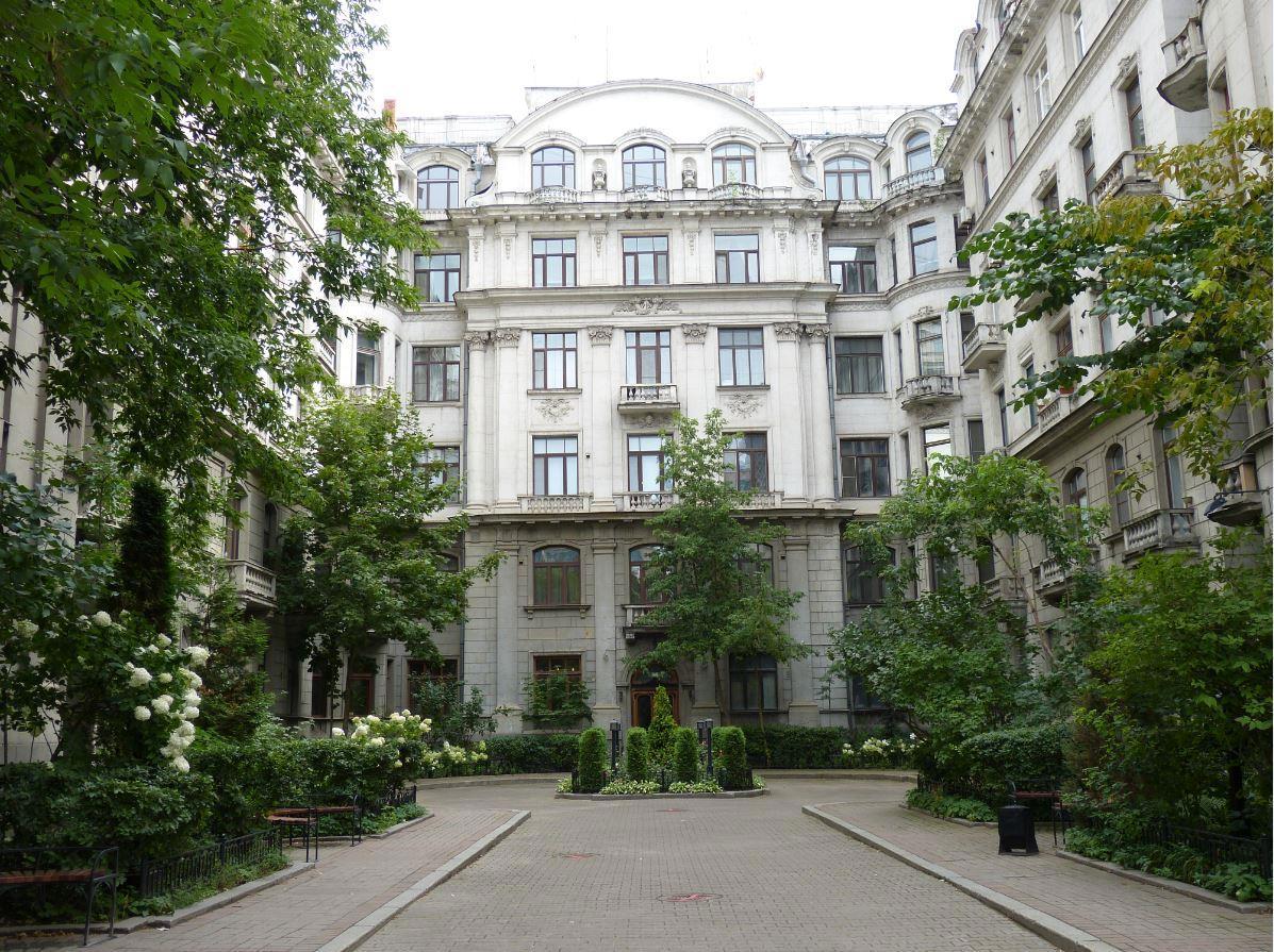 Соседний дом тоже проектировался Константином Васильевичем Марковым, а строился для него Владимиром Алексеевичем Щуко в то же самое время. А по внешнему виду — типичный сталинский ампир! И неудивительно, ведь В. А. Щуко считается одним из отцов этого архитектурного стиля. Получается, что его основные элементы были продуманы и хорошо отработаны ещё до начала Первой мировой войны.