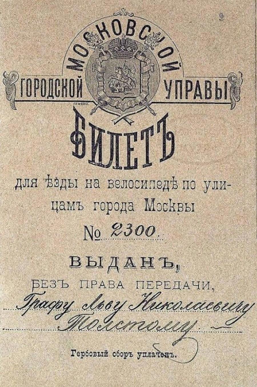 Велосипеды тогда стоили 200 — 300 рублей и были доступны лишь состоятельным людям. Но зато эти важные персоны могли позволить себе значительные траты на создание велотреков, которые тогда назывались циклодромами. В Москве первый циклодром появился в 1891 году на Ходынском поле. А в 1894 году московские велосипедисты добились от властей резрешения ездить по улицам города. Но для этого требовалось пройти всю процедуру с экзаменом в полицейском участке и получением именного велосипедного билета. Правда, члены официально зарегистрированных велосипедных клубов были освобождены от сдачи экзамена на вождение. Так, к примеру, Лев Николаевич Толстой, ставший членом Московского клуба велосипедистов в начале 1896 года, получил 21 февраля 1896 года билет за номером 2300 без каких-либо испытаний в полицейском участке.