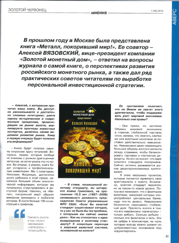 Автор: Алексей ВязовскийДал интервью журналу "Золотой червонец". Обсуждаем, в том числе, нашу с Ильей книгу "Металл, покоривший мир" (вот ссылка на нее на Автор Тудей). Кому интересно, скан...