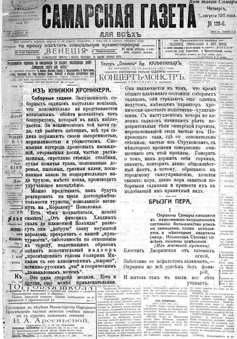 Среди «забавных» рассказов в ней есть и такой: на Казанской улице лежало огромное бревно, каждое утро отодвигаемое на обочину, и каждую ночь возвращавшееся горчичниками на проезжую часть для сбора дани с проезжавших. Городской голова выделил деньги, и бревно распилили. В «Самарской газете» писали: «… горчишники рыболовными крючками рвали одежду на прогуливавшихся горожанках в Струковском саду».