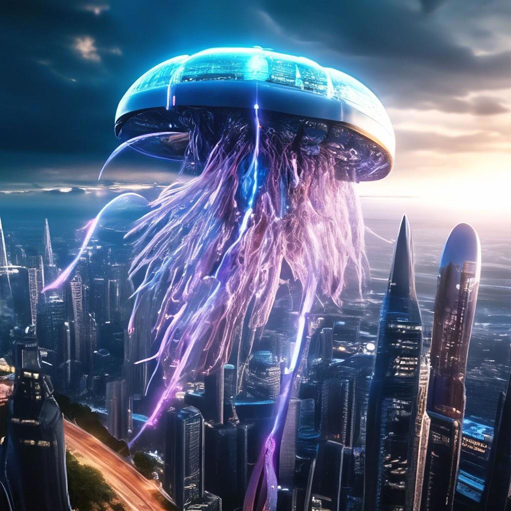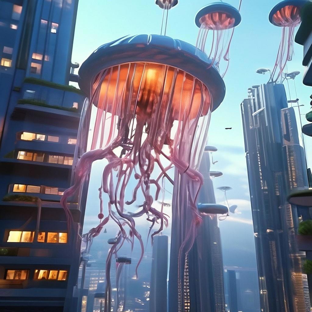 Автор: Елена Логинова (Анурова)Немного жути от нейросети. Фентази. Сюрреализм. Бионические медузы захватили город.